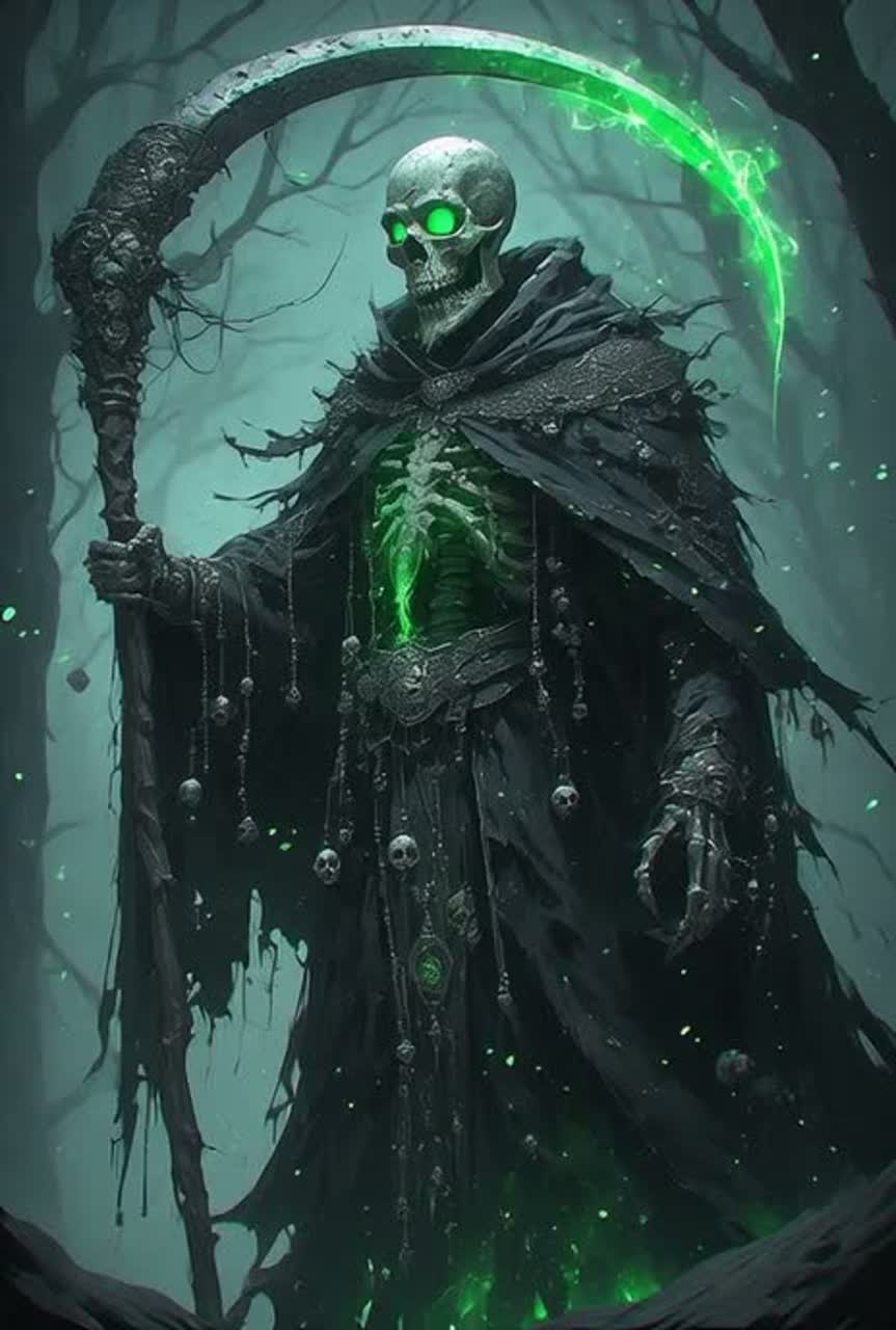 [Instrumentation: Haunting Celtic harp and resonant cello drones for melancholy march, clanging industrial percussion and rattling chains mimicking skeletal adornments, pulsing emerald-tinged synth pads that glow and slice, layered symphonic strings for swelling inevitability, glitchy electronic maelstrom swirls in breaks, ]