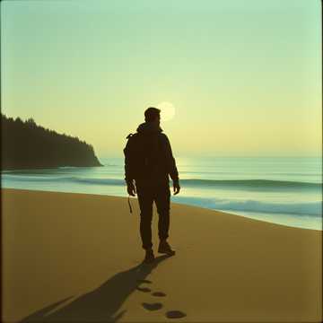 Dark folk ballad with steady, grounded pacing, Acoustic fingerstyle guitar, soft floor toms, low drones, and subtle ocean‑wind ambience, Warm baritone vocal, intimate and calm, with clear storytelling delivery, Mood is expansive, reflective, and quietly triumphant without force, Verses describe emerging from forest into shoreline dusk, moonrise, open sky, and the sea as a doorway home, Chorus opens wide: the old road speaking, the traveler carrying voices and miles, finding peace inside, Bridge is gentle and cleansing, tides moving in and out, Outro is mythic and serene: footprints fading, landscapes gathered in memory, the world whole and aligned, No harsh percussion, no bright pop elements, no electronic leads, Keep everything spacious, organic, and horizon‑wide