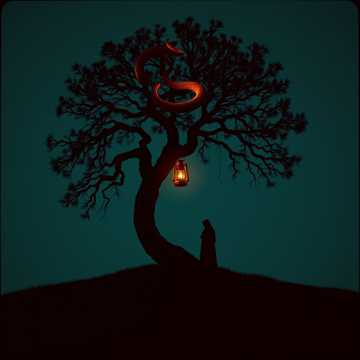 Dark folk textures unfold with delicate minor key acoustic guitar arpeggios, underscored by deep, evolving drone strings, A hand drum delivers a slow, pulsing heartbeat at 78 BPM, growing more urgent as the song progresses, Dual male and female vocals twist together—one whispering, one chanting—over chant-like melodies, Occasional medieval instrumental flourishes and subtle dissonances heighten the mythic, luminous darkness, Dramatic crescendos rise and fall, maintaining tense intimacy and meditative ritual energy