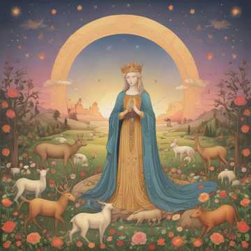 A medieval-inspired dark folk ballad built on earthy acoustic guitar, ritualistic pan drums, and gentle reverent humming, Soft harp lines weave with shadowed ethereal pads, while warm female vocals carry a sacred, mythic tone, The arrangement shifts between intimate storytelling verses and devotional, ceremonial choruses honoring the Empress archetype