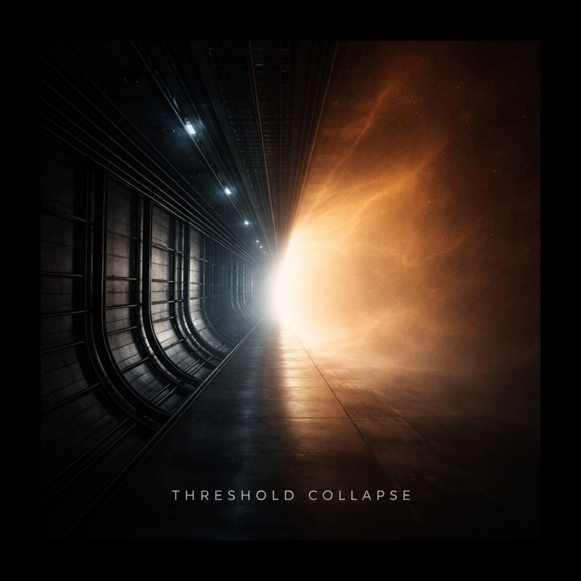 Create a 4 minute cinematic ambient instrumental titled “Threshold Collapse, ” Theme: rigid permission systems dissolving into open sovereignty, 0:00–1:30: Cold, industrial, claustrophobic, Tight quantized metallic percussion, Subtle office machinery, stamping rhythms, clock ticks, Sterile narrow-band synth beds, Repetitive, bureaucratic, oppressive, No melody, 1:30–3:30: Gradual decay, Quantization drifts, Metallic loops lose authority, Warm organic pads slowly enter, Breath textures, wood resonance, natural harmonics, Cold elements fade without violence—structural irrelevance, 3:30–4:00: Only warmth and open space remain, Wide stereo pads, Single sustained hopeful tone, No climax, Just release, Bottleneck dissolved, Mood: tense → unsettling → dissolving → spacious, hopeful, No verse/chorus, One slow arc