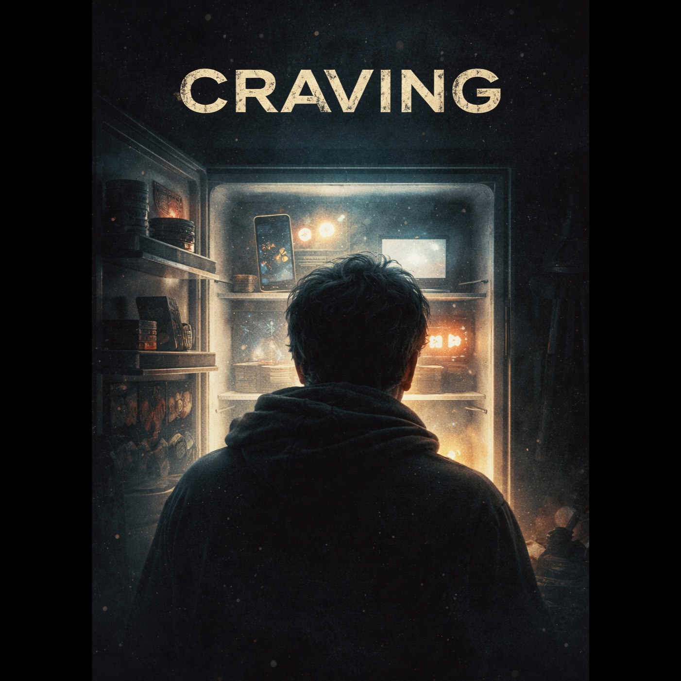 Theme: the architecture of hunger — not for substances, but for stimulus that regulates internal state, We ingest notifications, praise, price, outrage, identity — believing something is missing, Mood: familiar, restless, intimate, A quiet realization unfolding, Mirror, not warning, Deep hypnotic bassline like an unmet need, Sparse uneasy but beautiful synth textures, Slow steady pulse — a heart that doesn’t know it’s already full, Subtle ambient details: distant crowd murmur, faint notification ping, soft glass clink — like memory echoes of feeding, No chorus, Cyclic structure, Gradual tension, One subtle awareness moment near the end, End unresolved