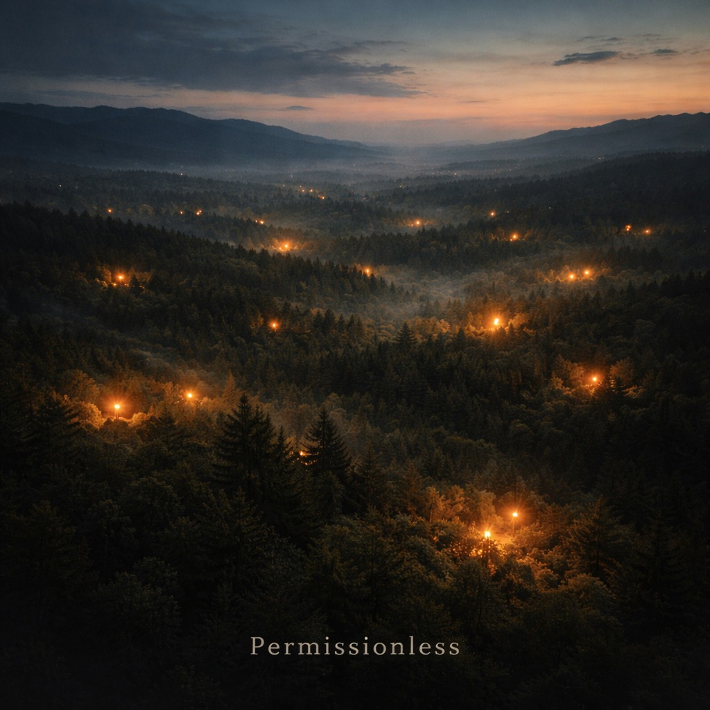 Theme: decentralized emergence, Many independent actions forming harmony without central control, Warm evolving synth pads layered gradually, Multiple soft rhythmic patterns at slightly different tempos, overlapping but not locked, No dominant lead, Acoustic textures: wood resonance, breath layers, soft mallet percussion, distant workshop ambience, Deep clean bass pulses at long intervals like parallel machinery, Patterns build slowly like tree rings, No climax, No conductor, Just accumulation and coexistence, Ends open and unresolved, still growing, Mood: organic, patient, emergent, sovereign