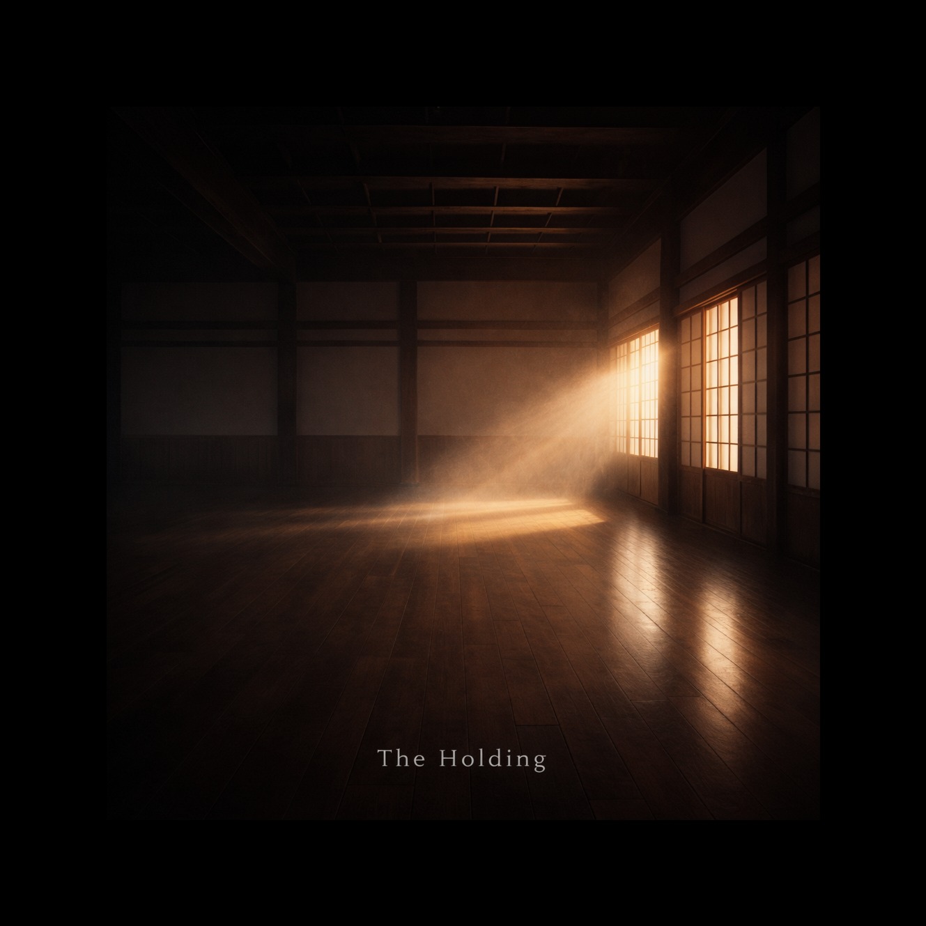 Create a four minute minimalist neo-classical instrumental, 'The Holding, ' Theme: inner architecture—restraint, self-governance, calibration, Acoustic guitar, fingerpicked with precise, steady timing, Repeating pattern, No flourish, Deep resonant cello or warm bass synth underneath—slow, sustained tones, Subtle percussion only: wooden block or single muted drum hit at deliberate intervals, No rhythm section, No build, Clean, spacious reverb, Wide stereo field, No melody—only disciplined pattern, Pattern over melody, Mood: morning dojo, Clear, Focused, Patient, Controlled breath, No tension, no climax, Just presence deepening, Ends with one intentional final note, Then silence