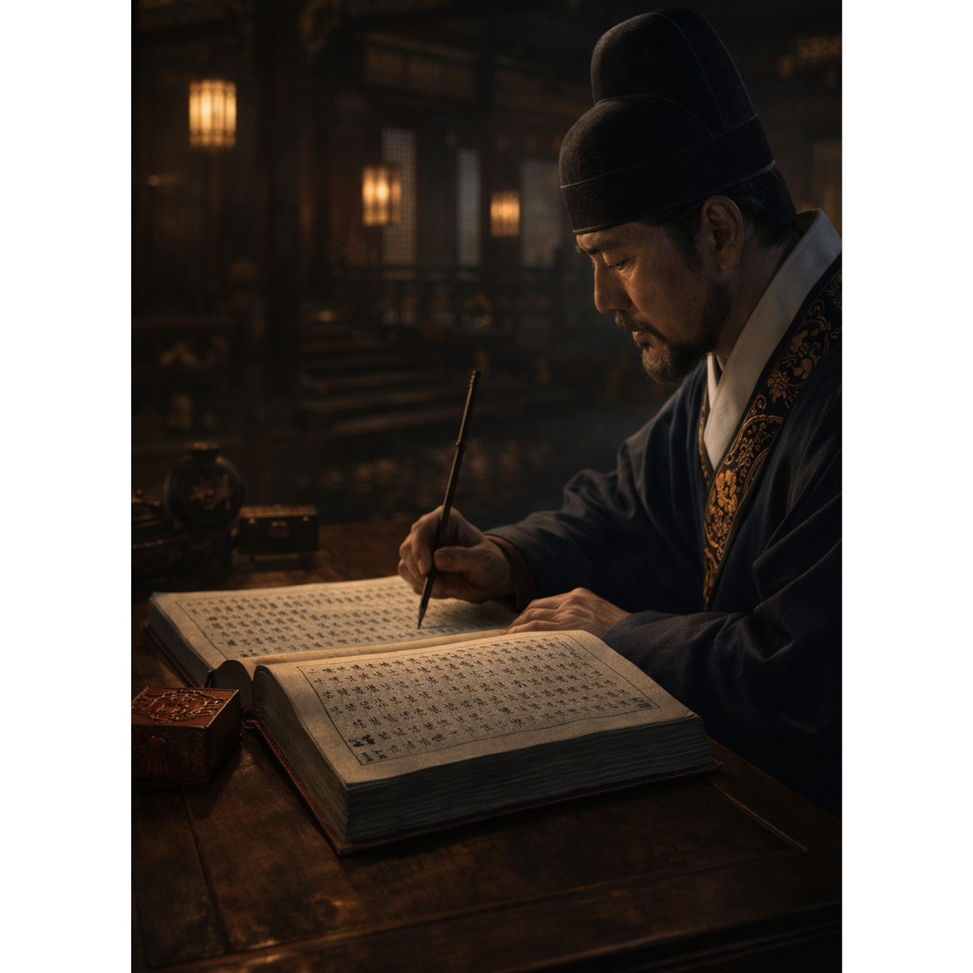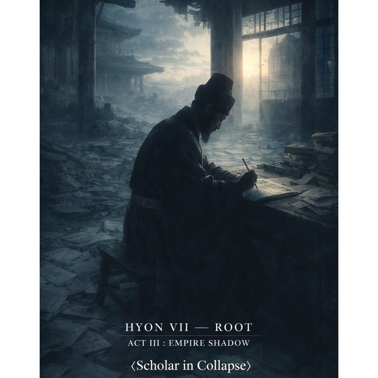 Symphonic progressive rock ballad, 96 BPM, Piano intro with cinematic strings, Vocal tone intellectual, restrained, steady breath control, No screaming, no dramatic crying, Minimal reverb, clear diction, forward vocal mix, Theme: Grand Scholar Yunmun during King Gongminโs anti-Yuan reform era, Political tension, ideological conflict, structural reform through knowledge, Atmosphere dignified, thoughtful, strategic, Emphasize endurance through scholarship rather than violence