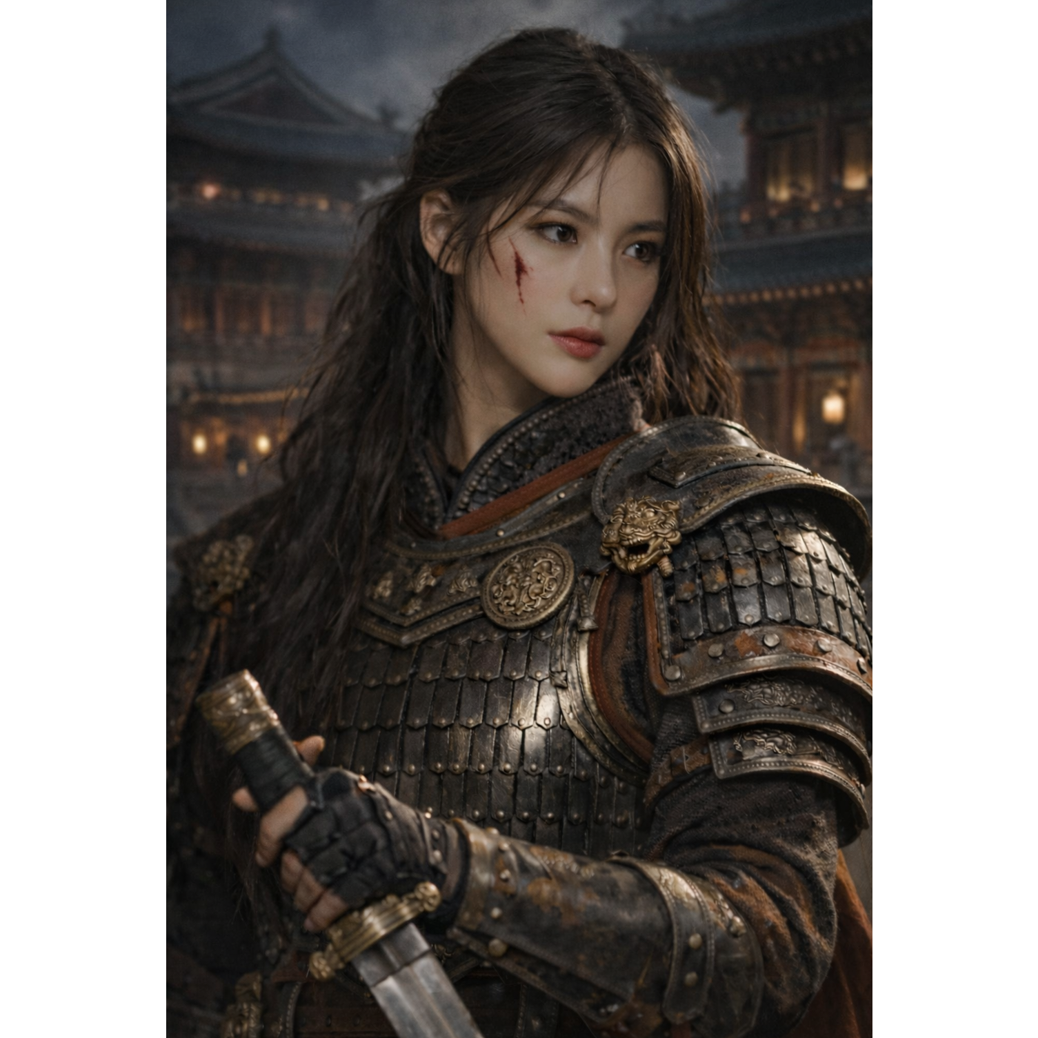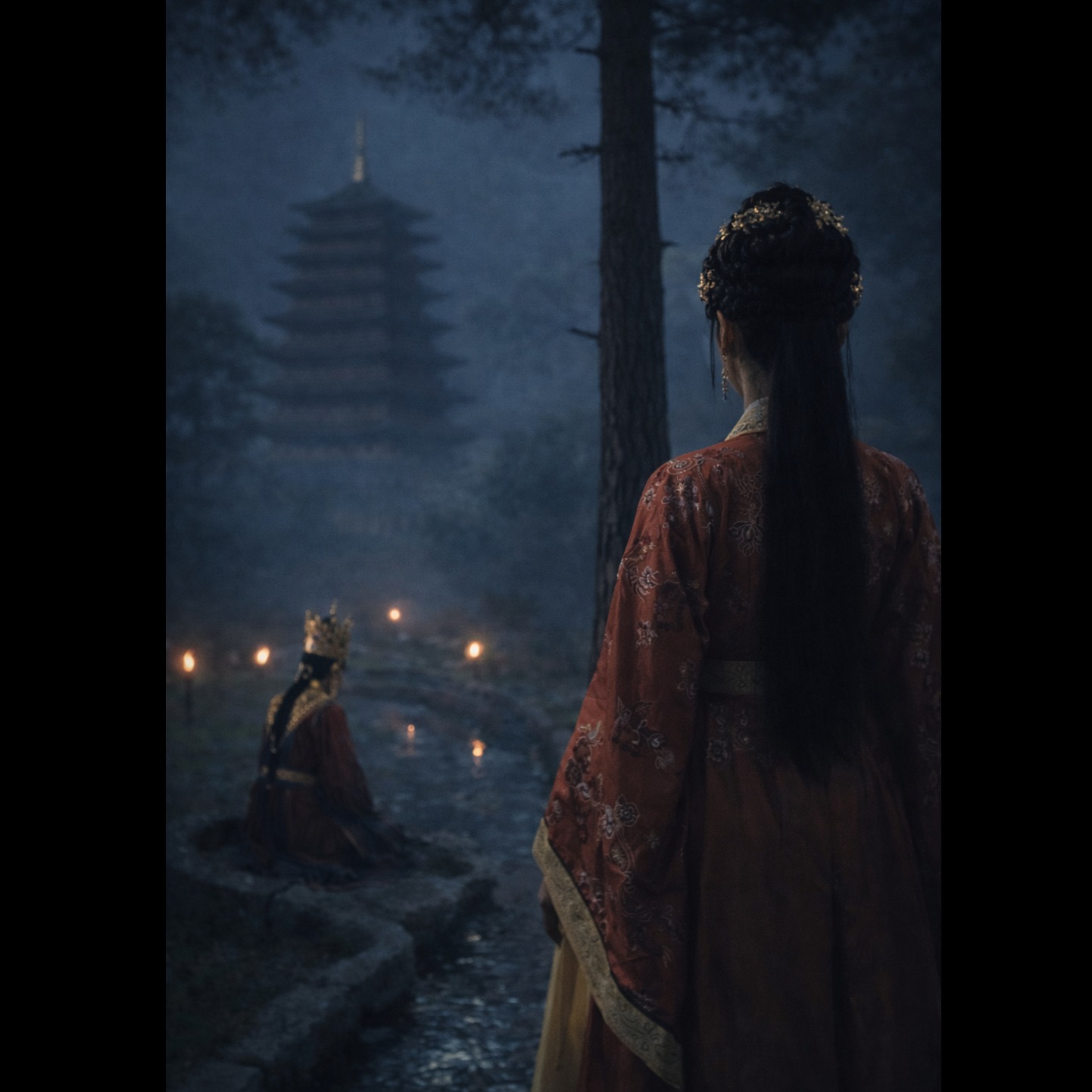 Dark symphonic metal with restrained cinematic tension, 90โ94 BPM, minor key, Slow ritual percussion intro, low strings and distant war drums, Female lead vocal (YEONI style): penetrating high notes that cut through distorted guitars, controlled grit, no muffled tone, no washed-out reverb, Vocal placed fully front in mix, minimal ambience, Traditional Korean vocal attitude (like pansori discipline), not screaming, sustained high notes with slight delayed bends, open-ended phrase endings, Emotion is restrained, not explosive, Theme: heir who survived instead of inheriting, Heavy chorus but dignified, not chaotic, Epic but controlled
