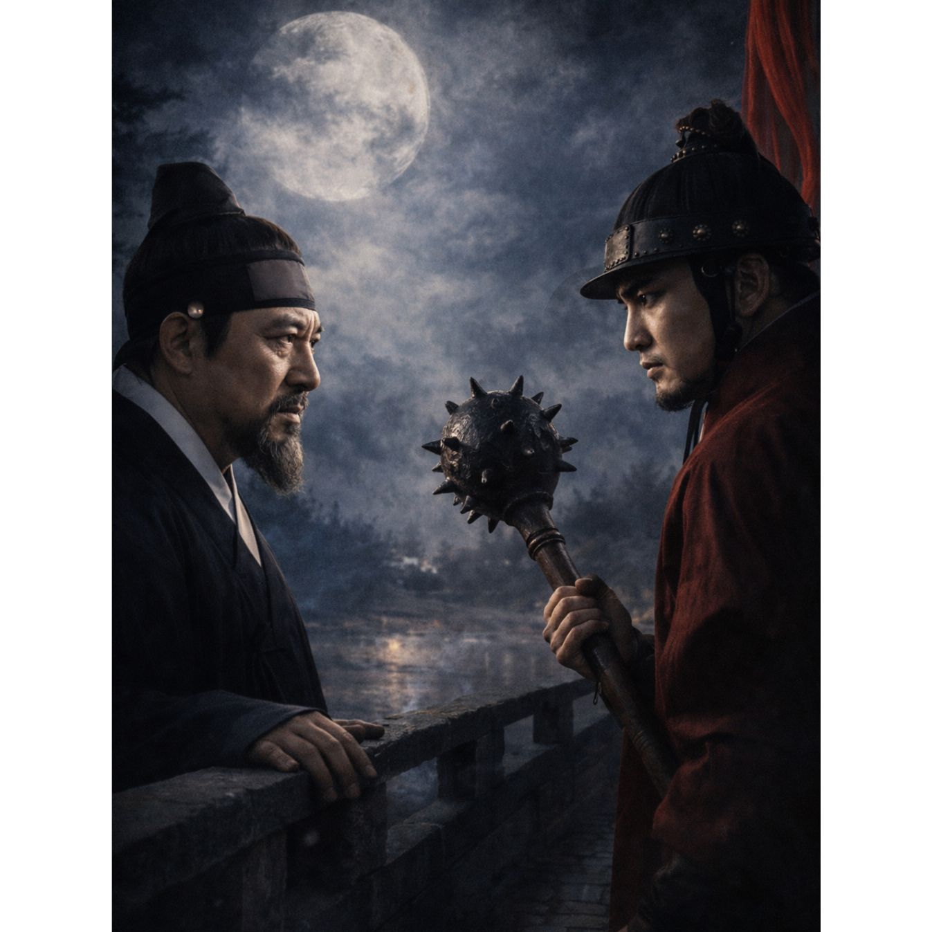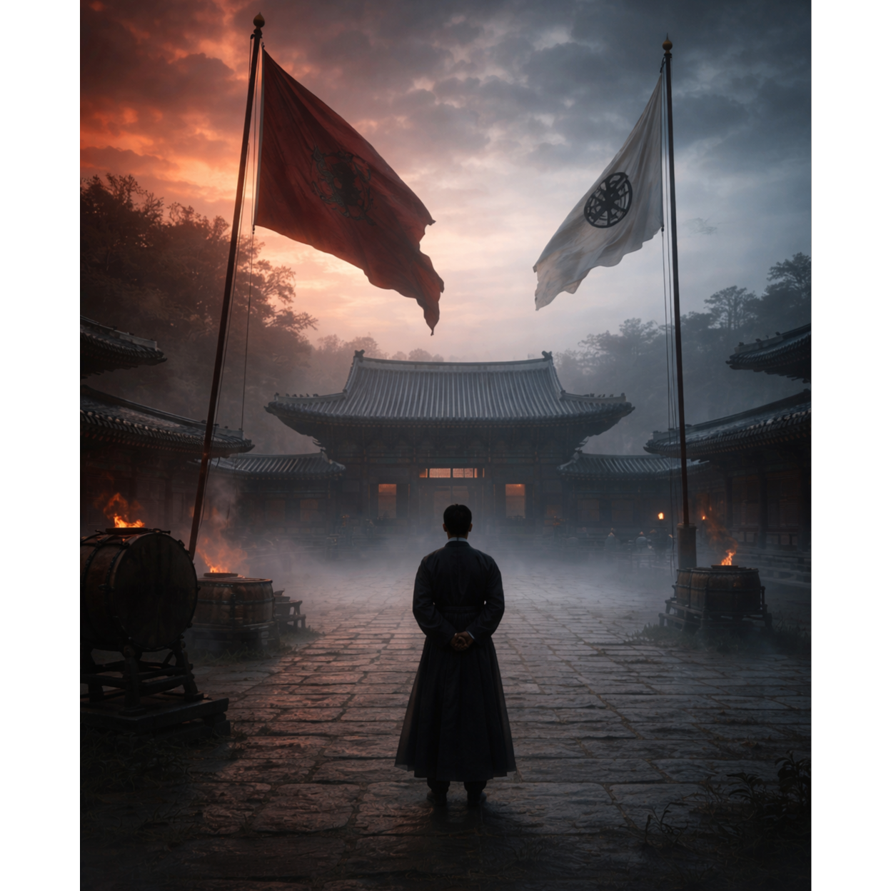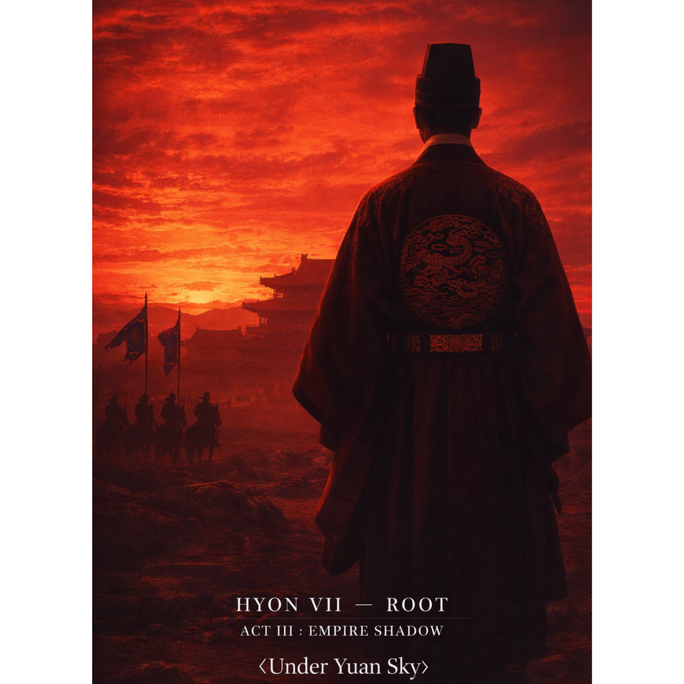 Epic historical metal, 122 BPM, Deep male vocal with restrained authority, not screaming, Minimal reverb, dry forward mix, Cinematic low drums, traditional Korean percussion accents, heavy but controlled guitar layers, Atmosphere of political tension and imperial diplomacy, Theme: accompanying crown prince to Yuan court, 3 years in Shenyang, return to Goryeo, execution of Wang Yuso and Song Bangyong to establish royal authority, Tone dignified, strategic, not emotional rage, Focus on power consolidation and survival within empire structure