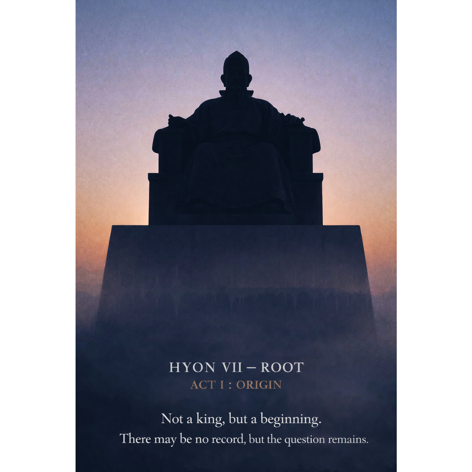 Orchestral cinematic intro, deep Korean traditional buk drums, low male narration voice at the beginning (calm, grounded, not theatrical), primitive tribal male chorus in unison, no pop elements, no modern synth lead, Massive low strings, slow tempo 70โ80 BPM, minor scale, tension-building, Emotional tone: not worship, but philosophical inquiry, Avoid heroic fantasy tone, Focus on weight, origin, silence between drum hits, Final section expands with full orchestra and layered male choir, Dark, grounded, historical atmosphere