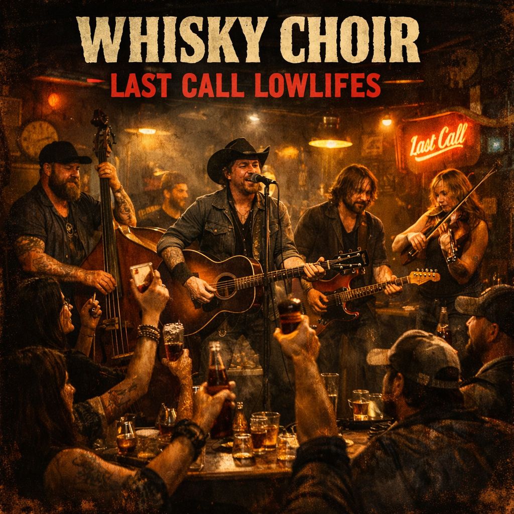 Male lead vocals, smoky and weathered, leaning on the mic with grit and grin, Mid-tempo dive-bar country/roots rock, Stomping drums, walking upright bass, gritty acoustic, greasy electric guitar licks, wild snarly fiddle, Raw, live-room energy with warm analog tone, Late-night bar vibe: cheap whiskey, neon flicker, lovable troublemakers, laughs too loud, stories too long, Imperfections left in, loose but driving groove