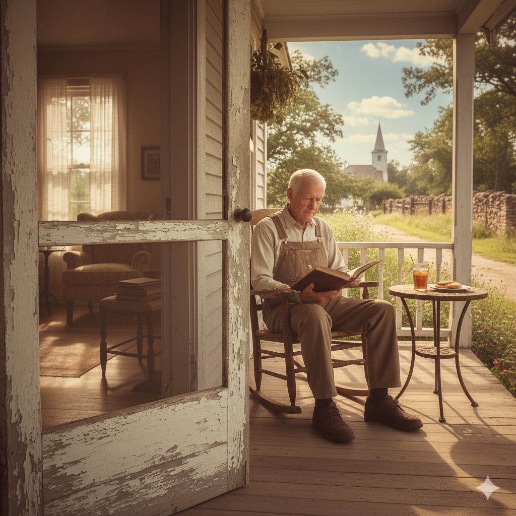 Country/Americana, Male lead vocal (Beau style): rough, weathered, intimate, storytelling-driven, Acoustic guitar central, upright bass, light kick drum, subtle fiddle or mandolin textures, Slow to mid-tempo, steady, with space between lines, Chorus features low, harmonies human and unpolished, Atmosphere: small-room porch/old church, reflective and humble, faith and life lived with cracks and grit, No stadium polish, no big reverb, no electric sheen, Let silence, breath, and natural imperfections carry emotion, ‑Humming, ‑chanting