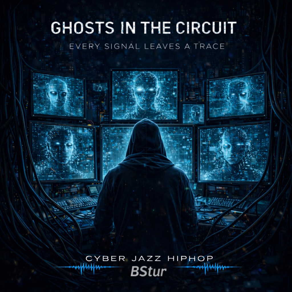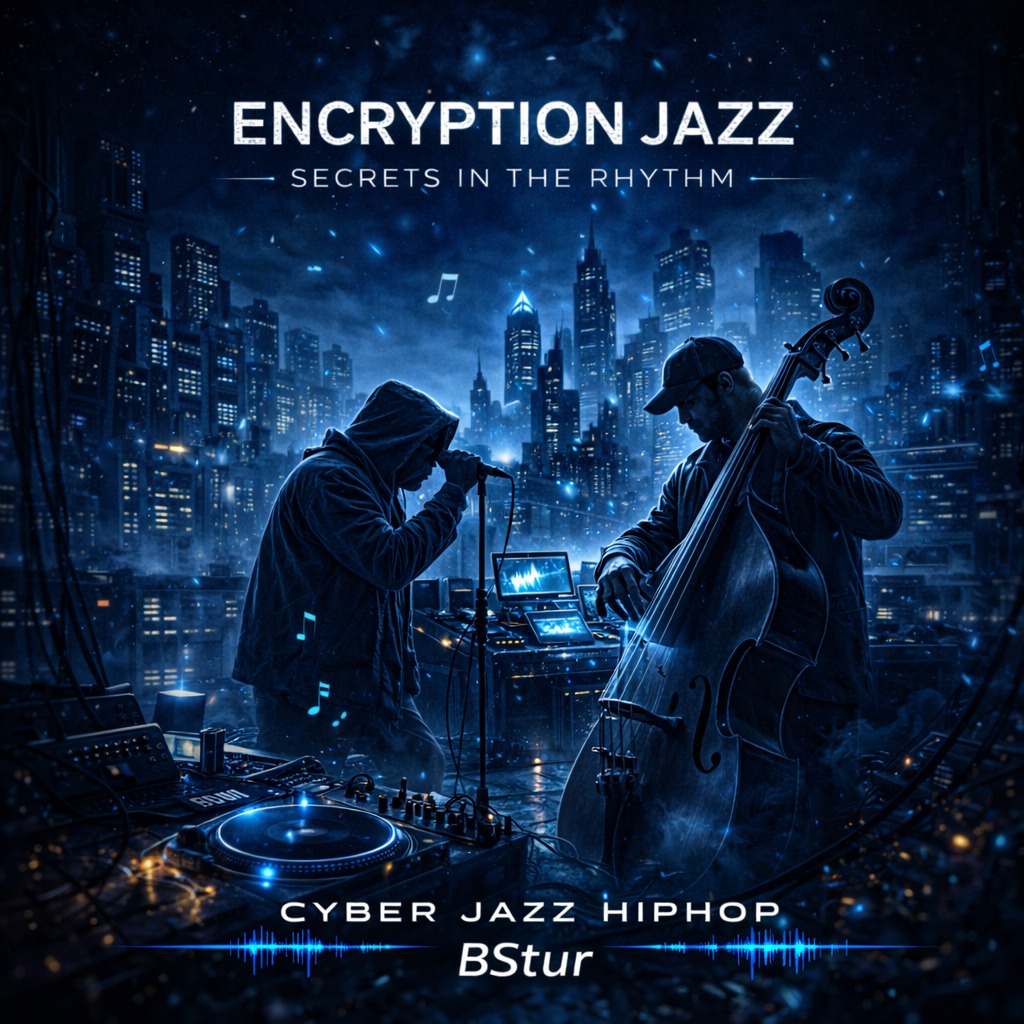 Opening with vinyl crackle, a moody Rhodes lays extended jazz voicings as dusty boom bap drums and saturated analog bass pulse at 104 BPM, Glitch percussion clicks and warped turntable scratches animate the backdrop, Spoken rap flows ride the minimalist groove as sparse digital effects dart between layers, conjuring a dystopian cyber jazz hip hop soundscape without horns—teeming with tension, mystery, and encrypted energy