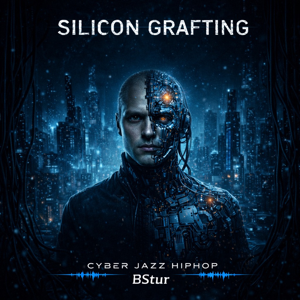 ~92 BPM Cyber Jazz Hiphop with a brutal boom bap beat, heavy sub bass pulses, aggressive vinyl scratches and glitch percussion, Machine sections feature distorted robotic protocol vocals, metallic percussion hits, radio interference, and cold analog synth drones creating a harsh dystopian cyberpunk atmosphere, Turntable scratches cut through the rhythm like corrupted data streams, Human sections introduce darker jazz textures: smoky Rhodes piano chords, upright bass grooves, muted jazz guitar stabs, vibraphone echoes and subtle accordion ambience, Brushed jazz drums support underground boom bap grooves while spoken-word hiphop verses and soft-sung human lines respond to the mechanical voices, The mood alternates between oppressive machine control and fragile human resistance, cinematic, gritty and rebellious, with glitch textures, beat drops and underground resistance energy, No saxophone, minimal brass