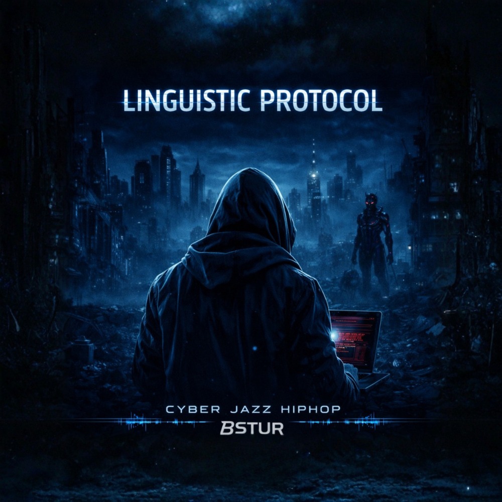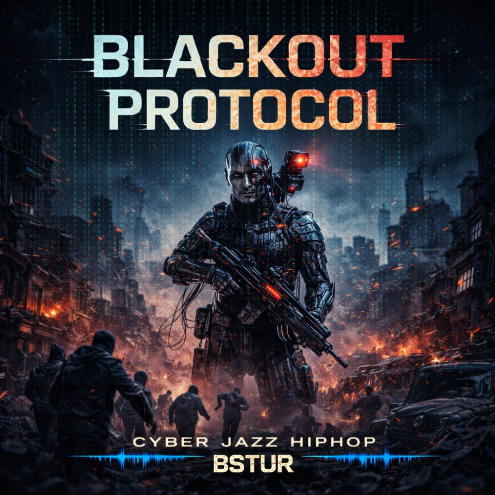 Cyber Jazz Hiphop, 94 BPM boom bap beat, heavy sub bass, aggressive vinyl scratches, dystopian cyberpunk atmosphere, robotic AI protocol voice with glitch distortion, dark mechanical groove, jazzy piano chords and upright bass for human sections, expressive jazz sax riffs, call and response between cold machine voice and human rap voice, underground resistance energy, cinematic tension and bass drops, Machine sections aggressive and mechanical, human sections smoother jazzy hiphop groove