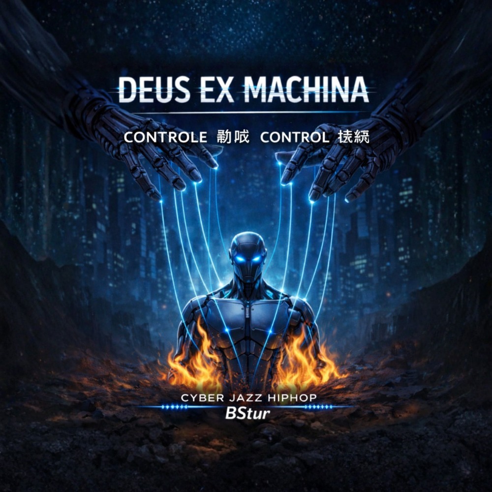 Dark electro jazz hiphop with a cinematic noir atmosphere, Slow 104 BPM groove with dusty hiphop drums, deep analog bass and Rhodes piano chords, Muted jazz trumpet echoes through a moody urban night soundscape with vinyl crackle and subtle ambient textures, The track alternates spoken rap verses in French, Chinese and Japanese, creating an international underground vibe, Minimal but powerful production with spacious dynamics, dark harmonic tones and a mysterious philosophical mood inspired by the idea of “Deus ex machina”
