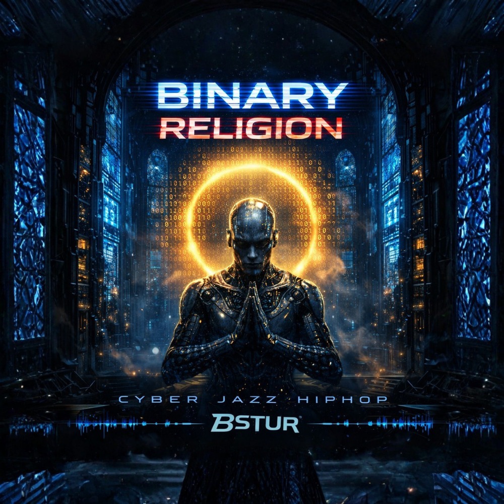 Cyber Jazz Hip Hop, dystopian digital ritual energy, mid-tempo boom bap groove around 92-96 BPM with heavy sub-bass drops, industrial hip hop drums, deep contrabass groove, dark cello layers, minimal piano pulses, aggressive turntable scratches, glitch percussion, distorted sax stabs, ambient choir pads like a digital cathedral, mechanical voice and ritual chant vocals, cinematic cyberpunk atmosphere, dramatic contrast between quiet ritual ambience and brutal cyber-hiphop beat drops, philosophical dystopian tone, futuristic underground broadcast energy