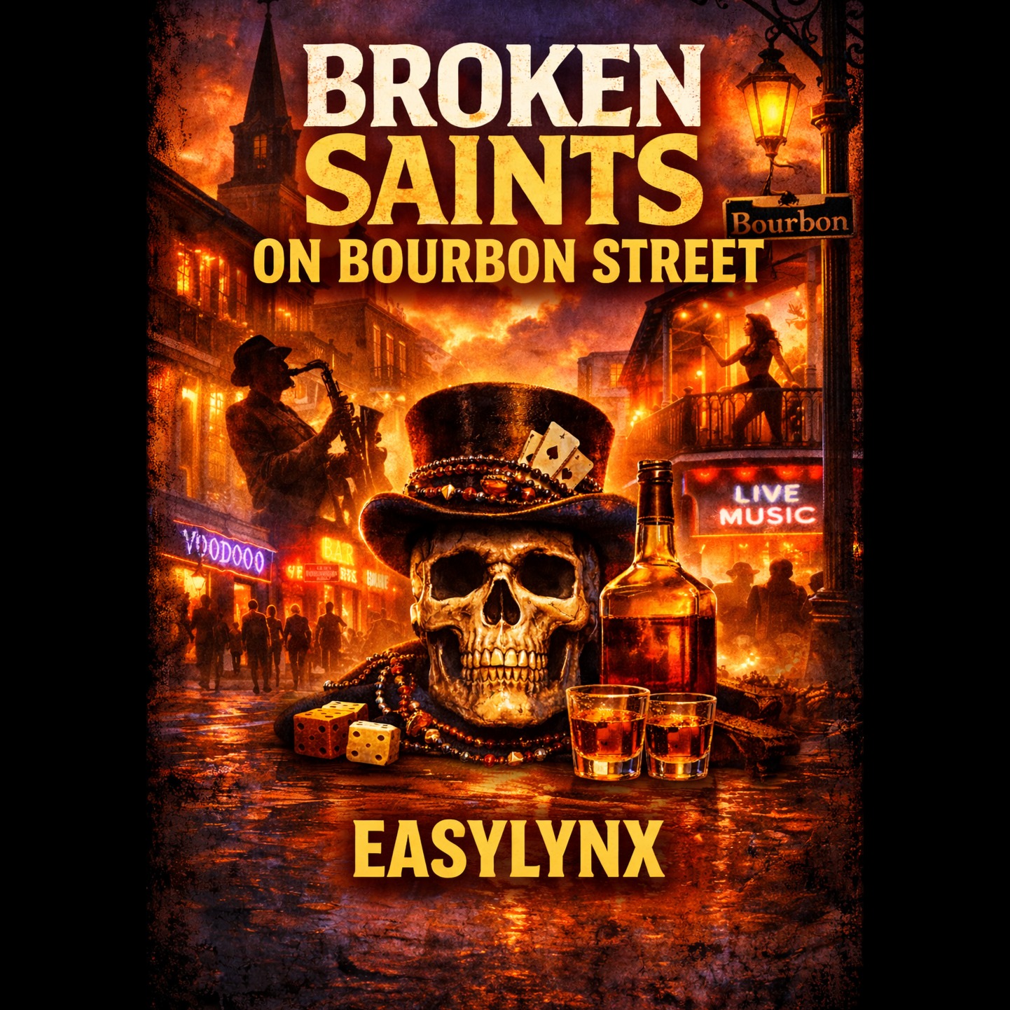 Gritty liquid drum and bass at 170 BPM, extended 3–4 minute arrangement, infused with New Orleans street blues energy, Rolling liquid drums with edge, deep gritty sub-bass, distorted bass guitar textures, Raw electric blues guitar riffs, street-style horn stabs, subtle organ grit, neon-night ambience, Raspy male blues vocal, emotional and lived-in, singing about broken saints, late nights on Bourbon Street, survival, temptation, and dignity in struggle, Clear structure with dark intro, verses, powerful chorus, raw instrumental street break, heavy liquid drop, and worn but proud outro, Nighttime street realism, no polish, all truth