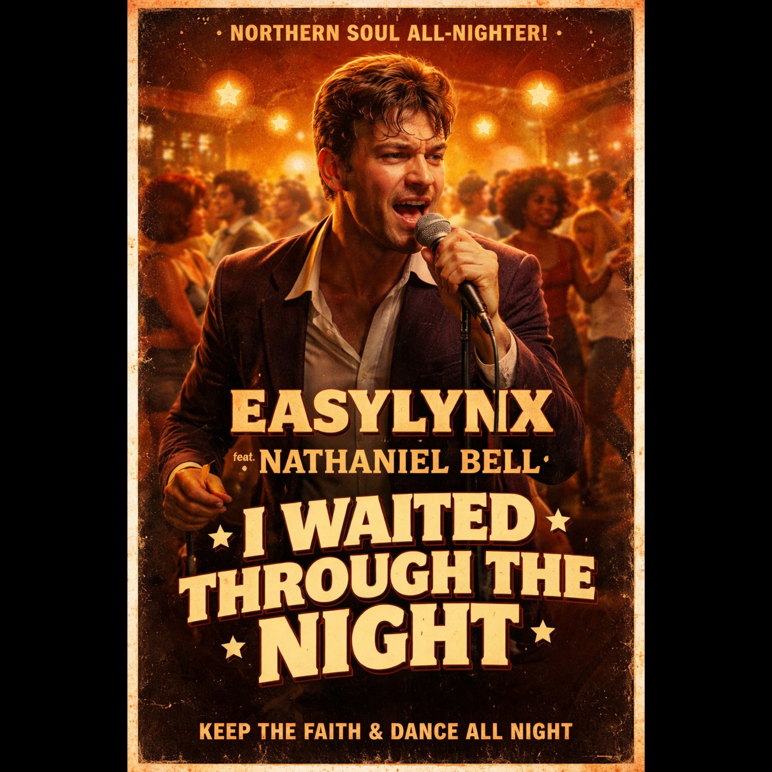 Northern Soul, late-night deep soul all-nighter, fast but moody tempo (124–126 BPM), driving stomp rhythm, heavy tambourine, crisp snare, walking bassline, minor-key chord progression, warm vinyl saturation, echo-soaked organ, subtle brass hits, emotional male lead vocal with ache and restraint, gospel-tinged backing harmonies, underground UK soul club atmosphere, longing, patience, love and time theme, 1960s Motown-influenced sound with raw dancefloor energy