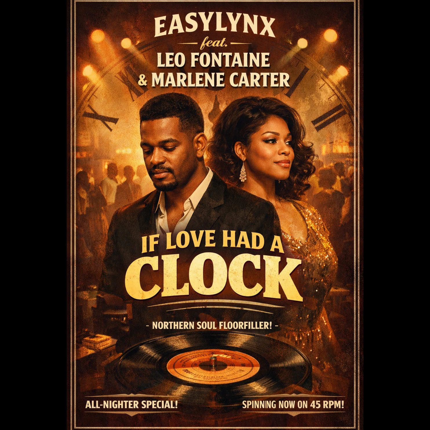 Northern Soul, reflective deep soul with driving dancefloor rhythm, mid-fast tempo (124–126 BPM), steady four-on-the-floor stomp, crisp snare, tambourine accents, melodic walking bassline, minor-to-major chord movement, warm Hammond organ, subtle brass lines, vinyl saturation, emotive male lead vocal with thoughtful delivery, layered female backing harmonies, late-night UK soul club atmosphere, introspective but uplifting, love and time philosophy theme, classic 1960s Motown/Northern Soul influence