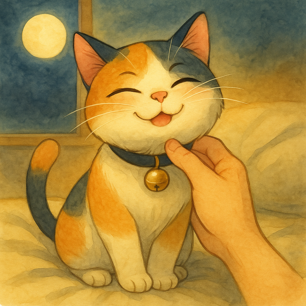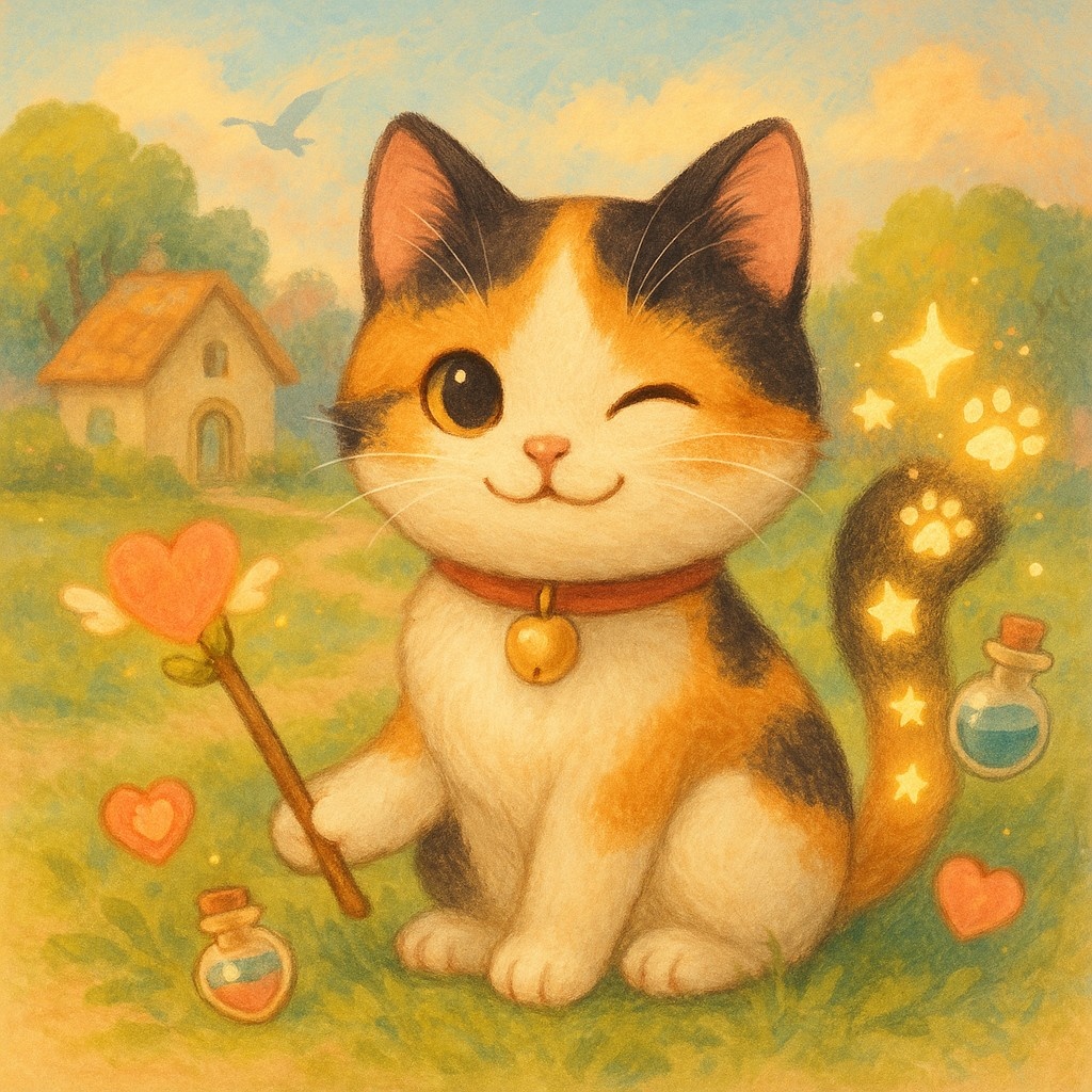 cute and whimsical J-pop with RPG fantasy vibes, soft female vocal, playful cat sound effects, acoustic and music box tones, gentle ukulele, glockenspiel, healing atmosphere, light chiptune touches, bouncy rhythm, ideal for a magical mascot cat character, ‑harsh transients, ‑distorted saturation, ‑excessive brightness, ‑overlapping piano/guitar, ‑sub-bass overload, ‑phase smear, ‑overcompression, ‑multi-layered orchestration, ‑long reverb tails, ‑sub-bass overload, ‑harsh transients, ‑phase smear
