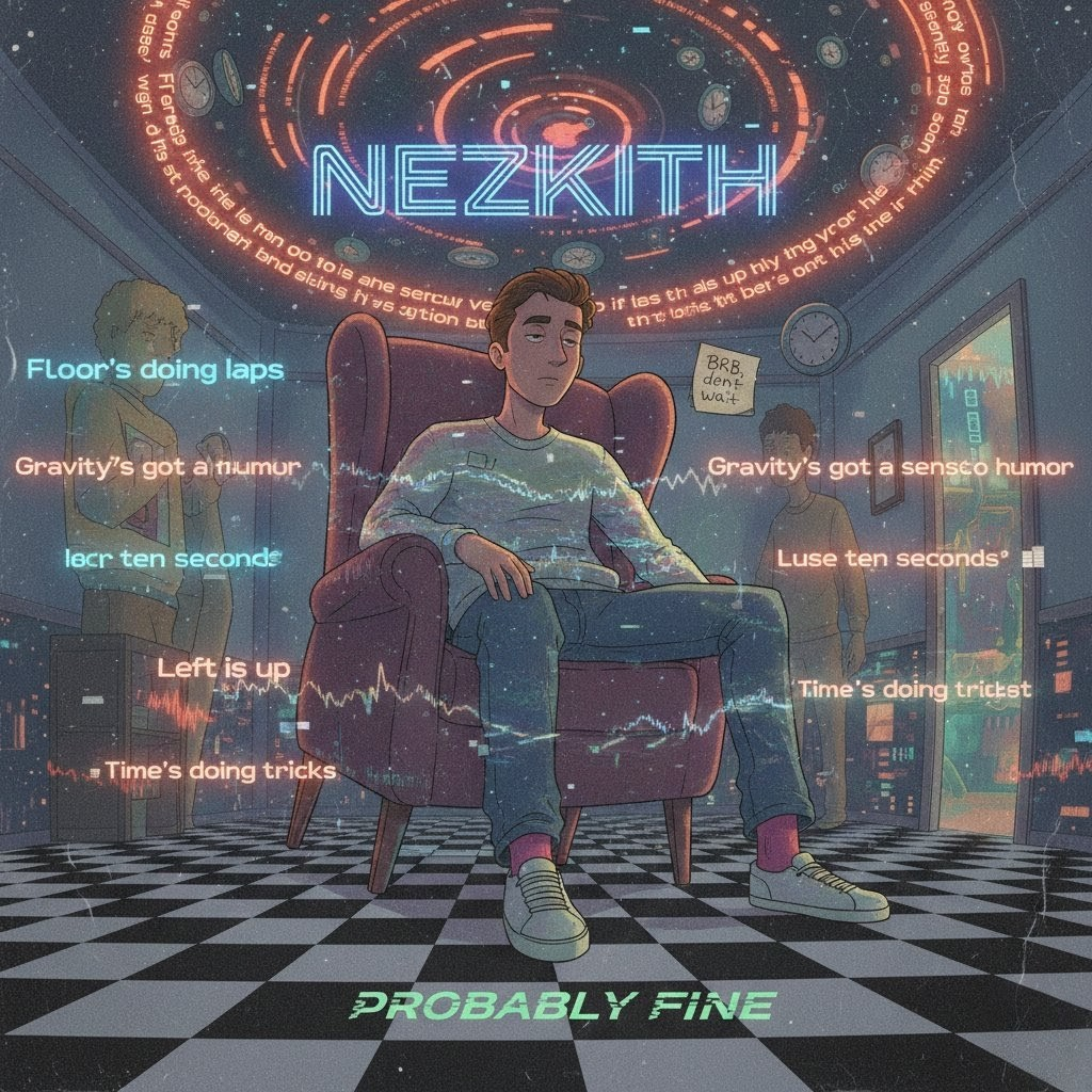 Mid-tempo alternative hip-hop/electronic with a woozy, animated feel, Loose, swung drum-machine groove that feels slightly delayed, like timing is slipping but nobody cares, Murky, rubbery synth bass that wobbles subtly in pitch, Detuned analog keys, melodica-style leads, and hazy pads that drift in and out, occasionally warping or cutting off mid-phrase, Glitchy dropouts, tape wobble, and soft distortion to suggest disorientation, Vocals are deadpan and conversational—male lead with a calm, blasé delivery, half-spoken rap with casual melodic phrasing, Lines occasionally stumble, self-correct, or trail off naturally, Background vocals are ghostly, filtered, and distant, like thoughts echoing late, Production feels polished but woozy, playful yet unsettling, Mood is surreal, everyday, and oddly relaxed—like something is very wrong, but it’s treated as just another afternoon