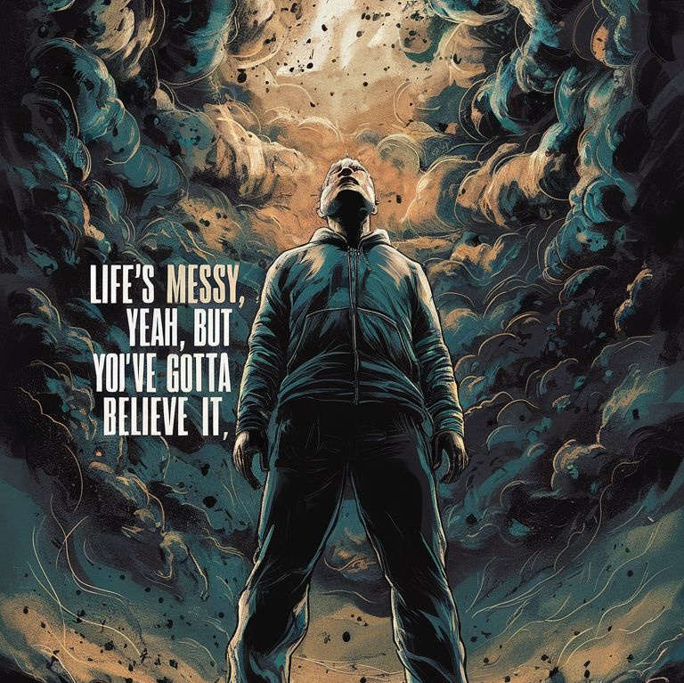 Upbeat tempo, 90 bpm, modern rap style, confident male vocals, urban vibe, sharp lyricism, bold beats, introspective yet empowering tone, minor key, driving rhythm