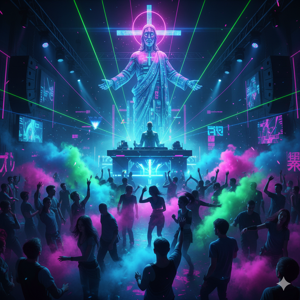 Glitchwave techno gospel acid trap with a sinister edge, resonant digital voice speaks with power of command, salvation through dissolution, loopable elements lurk in shadows "welcome to the new decay", synths thrum like power lines with surge and decay, deep bass, fragmenting neo divinity code