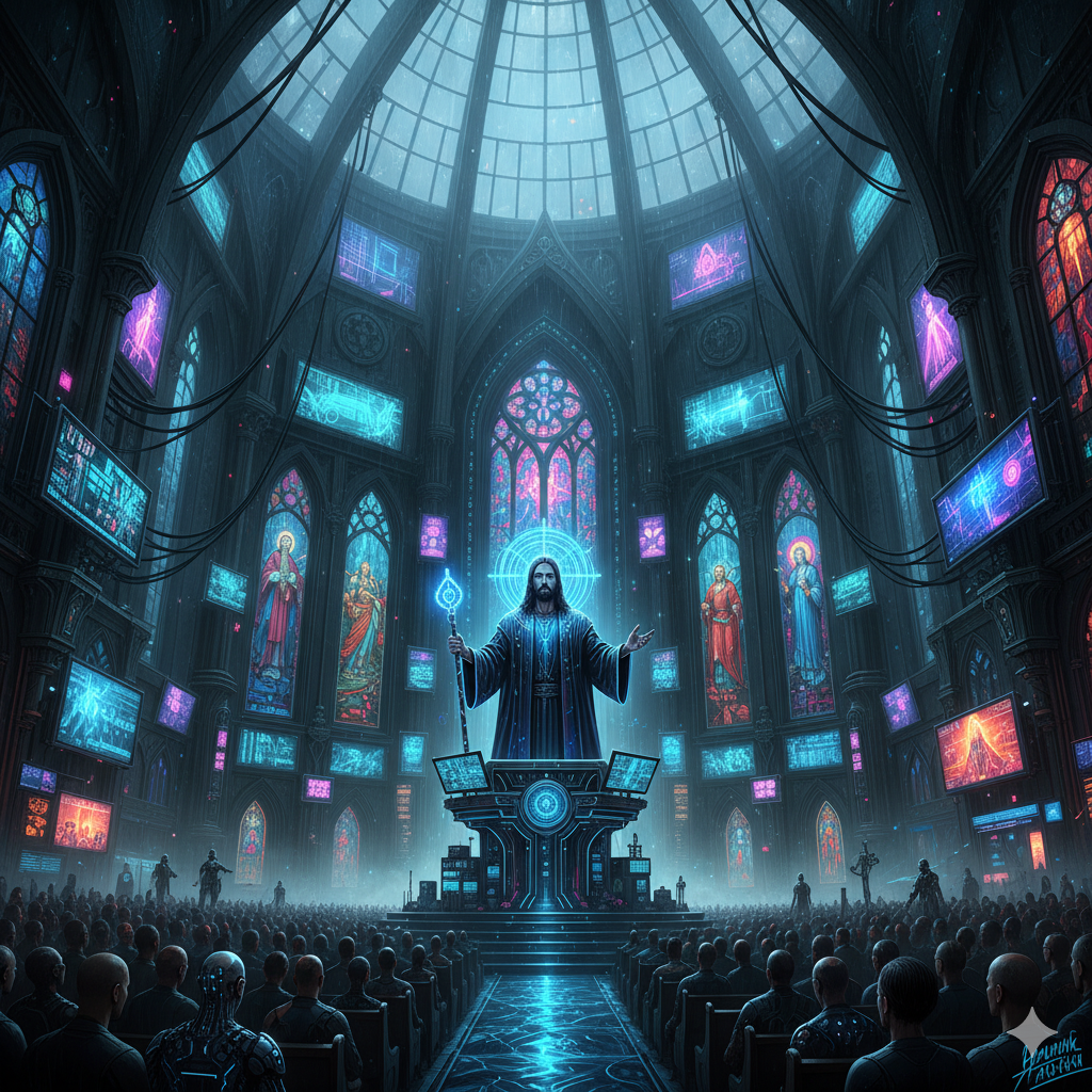 Glitchwave techno-gospel acid trap with a sinister edge, resonant digital voice speaks with power of command, salvation through dissolution, loopable elements lurk in shadows "welcome to the new decay", synths thrum like power lines with surge and decay, deep bass, fragmenting neo divinity code, dark hymnal virus, glitch elements include subtle pitch bending, stutter, repeat and distortion, reverent and expansive, you will submit