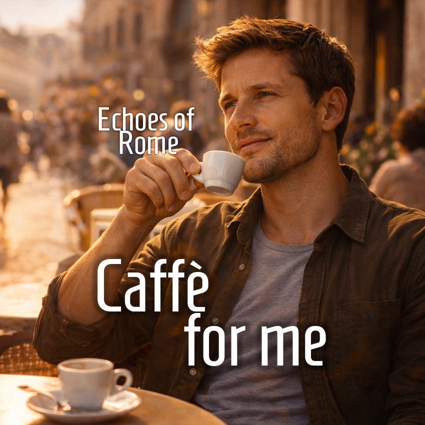 Warm acoustic pop with light Italian café jazz and bossa influence, Slow to mid tempo, soft acoustic guitar, gentle piano, upright bass, light percussion with brushes and shaker, Background café ambience, Male vocal, relaxed and intimate, Include a catchy repeating hook “Caffè for me, just let me be” with a warm, slightly playful tone, Smooth flow, no big climax, focus on atmosphere and charm