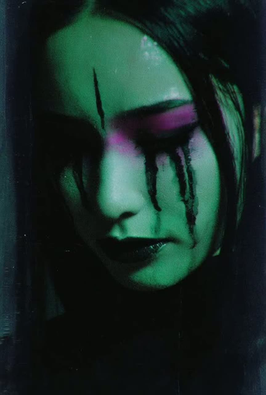 lo-fi, night core, horror pop, dark house, heavy metal, electronica, with elements of Jazz, and a saxophone that plays throughout, contralto female vocals, that fluctuate from lower to higher vocal range, layered vocals and sound