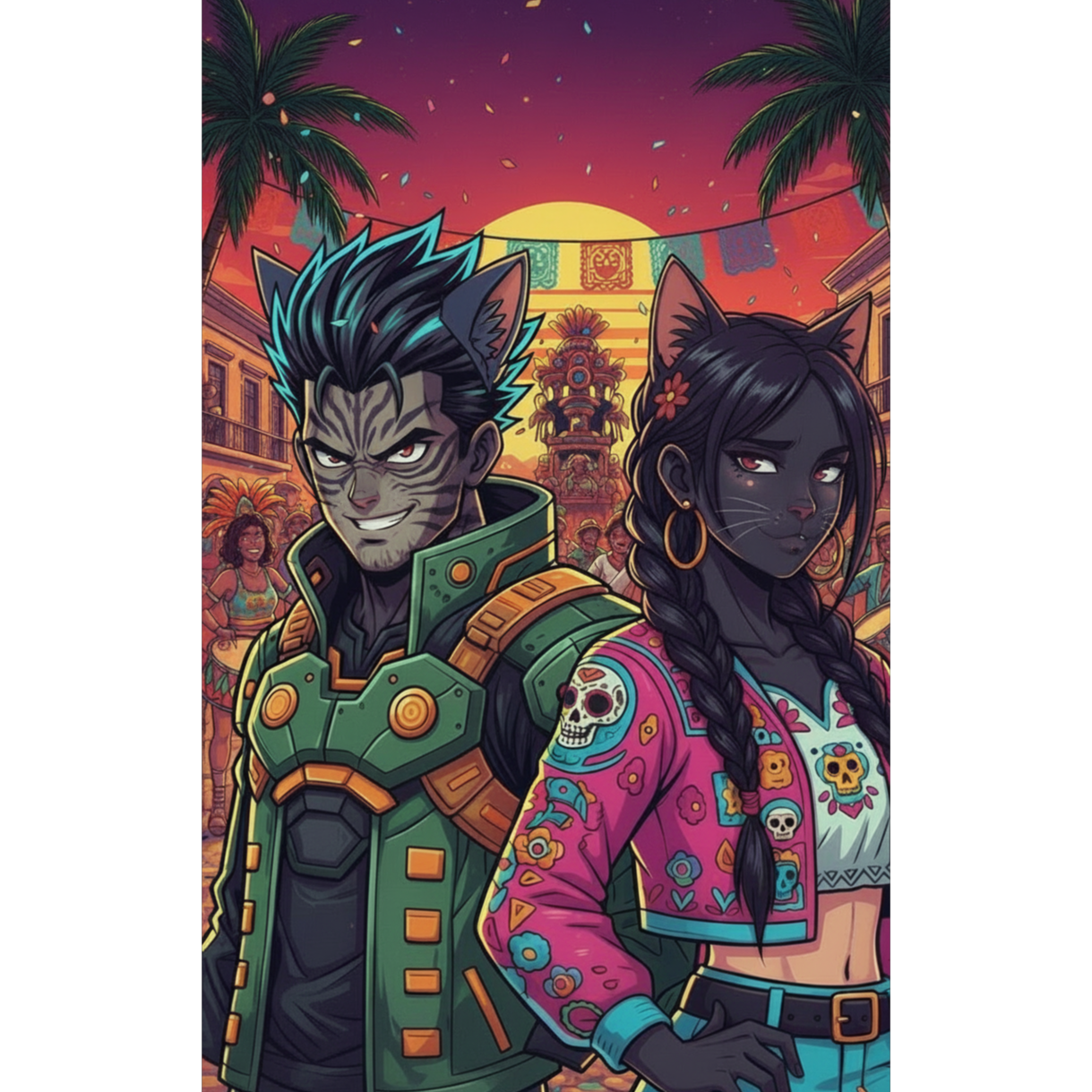 High-energy Latin-pop meets club banger: bright brass stabs and syncopated horn hooks over a four-on-the-floor kick and buzzing synth bass, Spanish guitars doing rapid rasgueado and percussive palm mutes, Verses ride a tight, rhythmic vocal flow; pre-chorus strips back to claps and filtered pads; chorus explodes with stacked chants and call-and-response ad-libs, Male or female vocals with playful attitude, lots of crowd shouts and dropouts to make the hips move, beats, techno