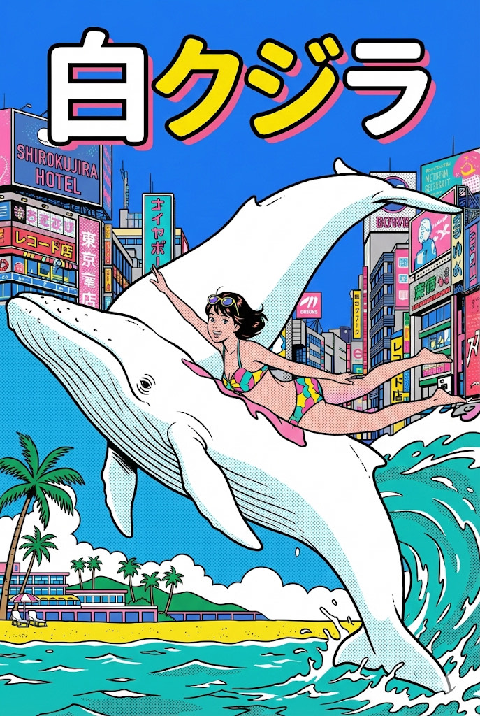 Japanese upbeat summer surf rock song inspired by '70s California surf bands and Southern All Stars, Catchy electric guitar riffs, bright harmonies, nostalgic beach vibes, playful and flirty Japanese lyrics with double meanings, references to ocean, waves, and "Shio-kujira", Chorus features "lalala" and fun call-and-response, Mood is cheeky, energetic, and carefree, Artist: [Anonymous]