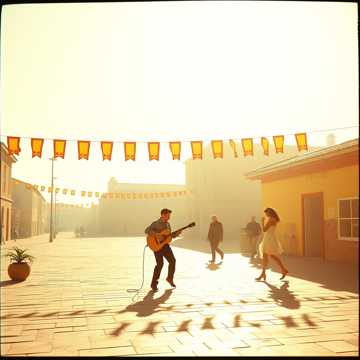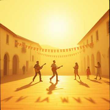 folk, Upbeat Spanish folk jota in 3/4 with bright nylon guitar lead, palmas locking the groove, and stomping dance energy, Verses stay intimate with single vocal and light hand percussion; each refrain bursts open with a small chorus singing in tight harmonies, claps riding on top, Brief instrumental guitar falsetas and clap patterns set up every chorus, all in a lively village-square room ambience, breaks, bright, natural