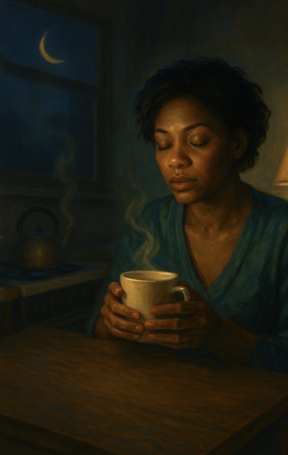 swing jazz, warm raspy female, slow bluesy lullaby, folk, crackly piano, acoustic bass, brushed drums, kettle noise, bittersweet, late night, gentle quiver with traces of joy and regret, lingering wisdom