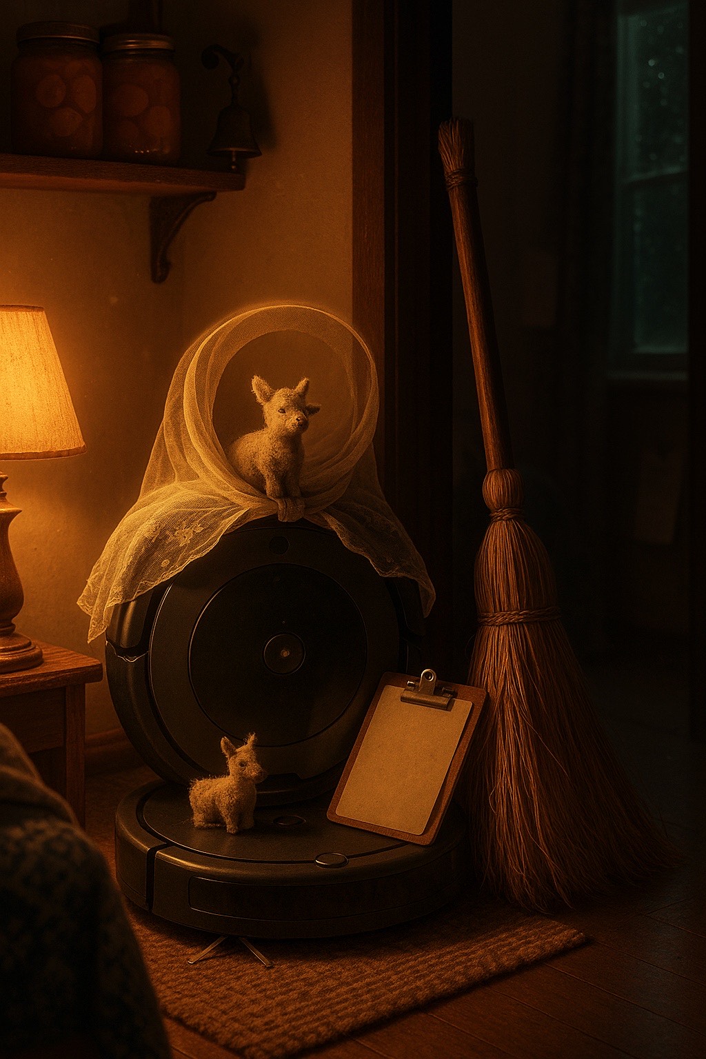 slow 3/4 lullaby waltz (~72 BPM); Eastern European folk lullaby; instruments: harmonium/pump organ, crackly upright piano, cello, upright bass, soft frame drum, brushed snare, kettle foley/room ambience; vocals: warm aged female, intimate close-mic with gentle quiver + low humming harmonies; production: tape hiss, vinyl crackle, soft plate reverb, warm mono-lean mix, natural room tone; arrangement: hushed intro and verses, chorus lift with humming harmonies and brushes, verse 2 adds cello movement, bridge strips to harmonium + piano then rebuilds, final chorus fullest then quiet kettle fade