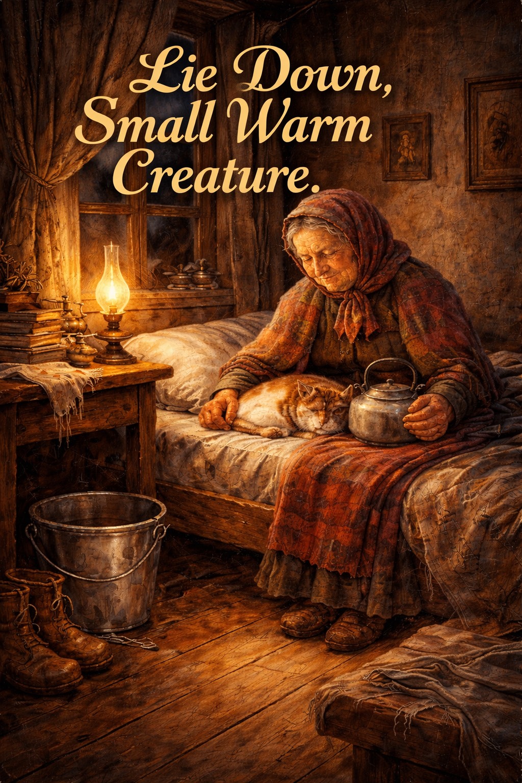 Baritone Thick-Accented Russian Woman Deep Register Vocal; Tender; Bittersweet Slavic Folk Lullaby; Glissando; Violin; Eastern European folk lullaby with gentle folk swing; instruments: harmonium/pump organ, crackly upright piano, cello, upright bass, soft frame drum, brushed snare, kettle foley/room ambience; vocals: warm aged female, intimate close-mic with gentle quiver, occasional spoken-sung village asides + low humming harmonies; production: tape hiss, vinyl crackle, soft plate reverb, warm mono-lean mix, natural room tone, close foley details; arrangement: hushed intro, verse restraint, chorus lift with humming harmonies and brushes, verse 2 adds cello motion and bass warmth, bridge strips to harmonium + piano then rebuilds, final chorus fullest then quiet kettle fade