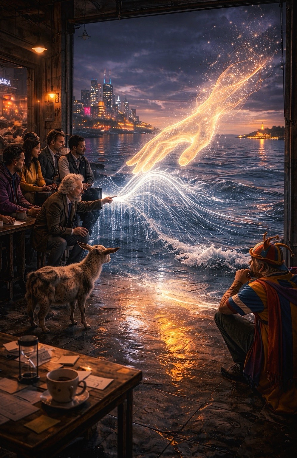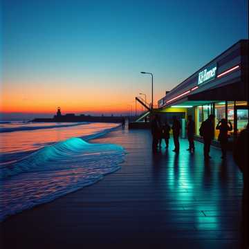 slow 74 BPM, straight pulse; dream-pop + ambient art-pop + boardwalk noir; instruments: fluorescent-hum synth drone, chorused electric guitar, detuned Wurlitzer, vibraphone, fretless bass, brushed drums, soft foghorn synth; vocals: intimate close-mic lead with distant harmony and low ghosted doubles; production: tape hiss, mall-PA reverb, wet-tile reflections, soft reversed swells, dark coastal air; arrangement: intro hum and Wurlitzer, restrained verses, choruses widen with guitar and harmony, bridge strips to drone and bass, final chorus blooms, outro fades to speaker static