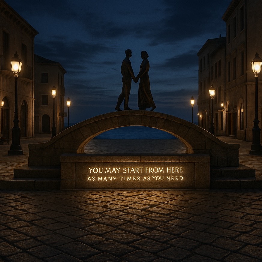Quirky groovy bedroom pop meets soft bossa-gospel shoegaze, with vocals: raspy, soulful, slightly off-kilter, conversational, Mid-tempo (90–100 BPM), warm funk bass, lazy pocket drums, dreamy guitars, subtle gospel-ish backing vocals, light vinyl hiss and radio texture, Late-night rooftop broadcast over a neon coast, Lyrics are symbolic and hopeful, a bit bittersweet, with recurring “start from here” hooks that feel like a mantra, not a jingle