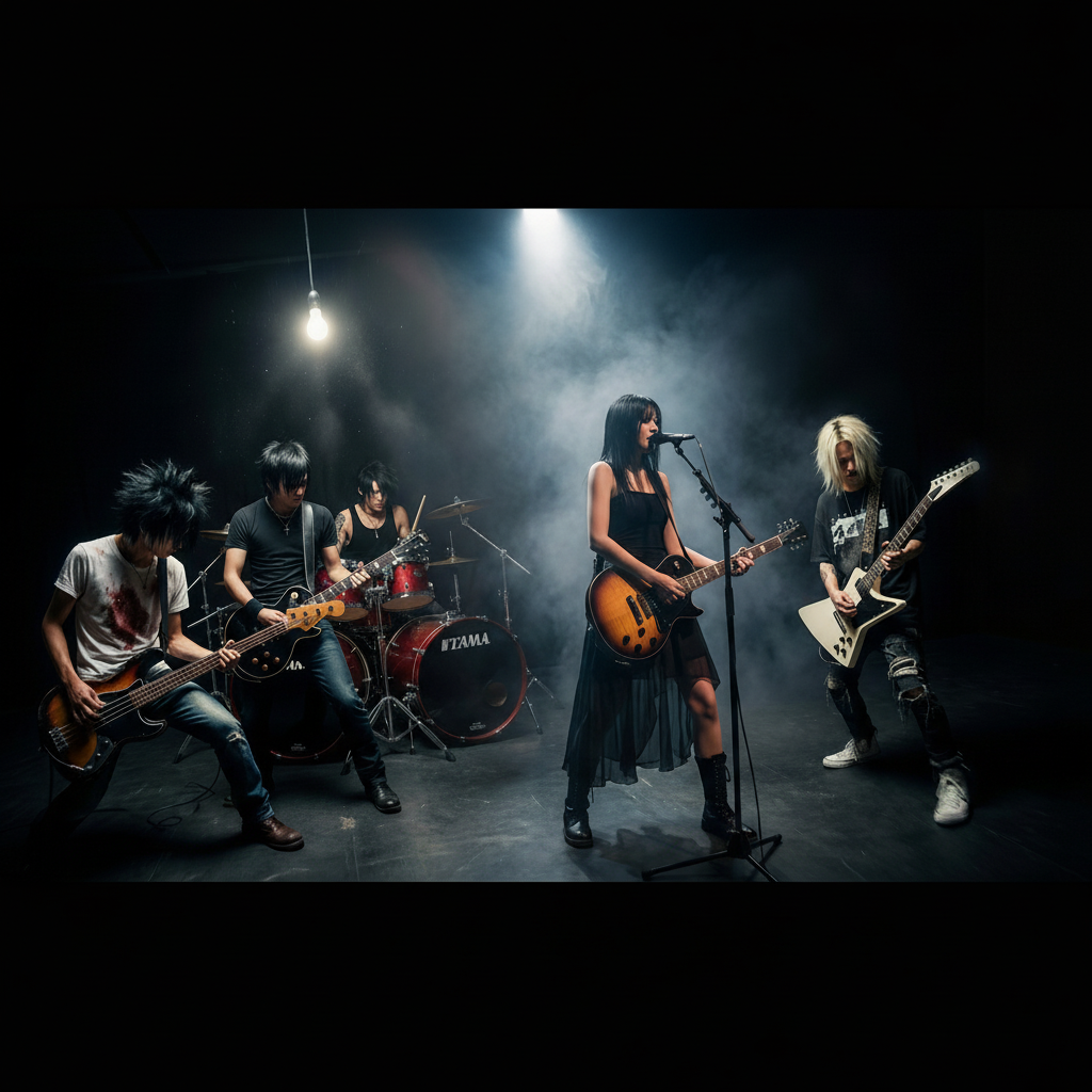 AI-generated digital hardcore rock band with raw human spirit, BACK LINE style, Explosive digital hardcore punk at BPM 190–200, loud, fast, and aggressive, Solid, tight, and raw distorted guitars in a twin-guitar setup (Explorer + Les Paul), Heavily overdriven, growling distortion bass with strong low-end presence, Drums use a TAMA kit with a heavy, tight kick and a sharp, lively snare, Cymbals are Zildjian, Prioritize a raw, live-band feel over perfection, Vocals are hoarse, dirty, and distorted, Emotional, exposed singing without excessive screaming, This is not a heroic voice, but a voice of survival, Do not change the original melody, Song structure and melodic lines must remain intact, This is a respectful cover of “The Frontliners” by FUKAMITOTO (深海魚), This is not a victory song, but a declaration of endurance, This is my fucked-up frontline — and I’m still going to survive