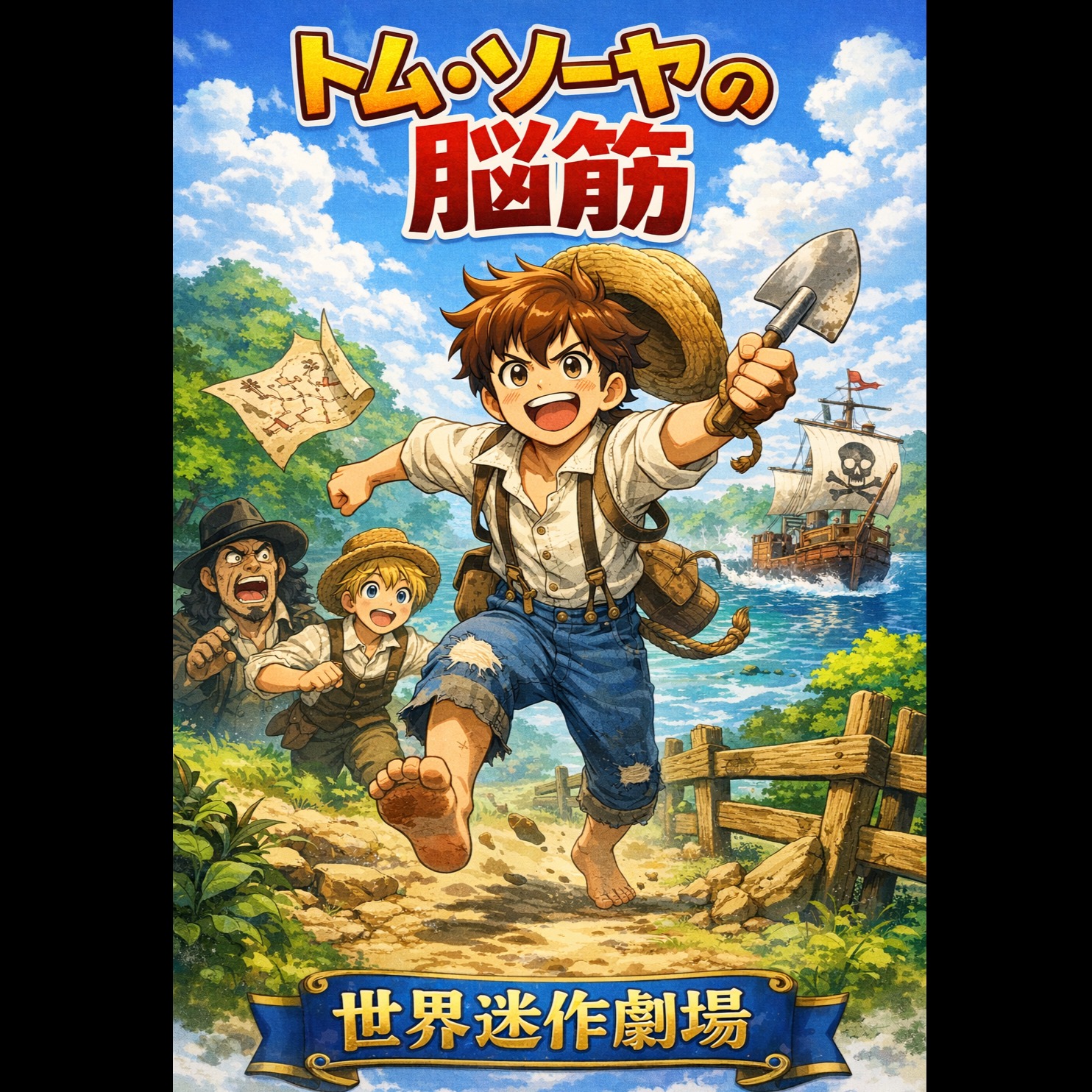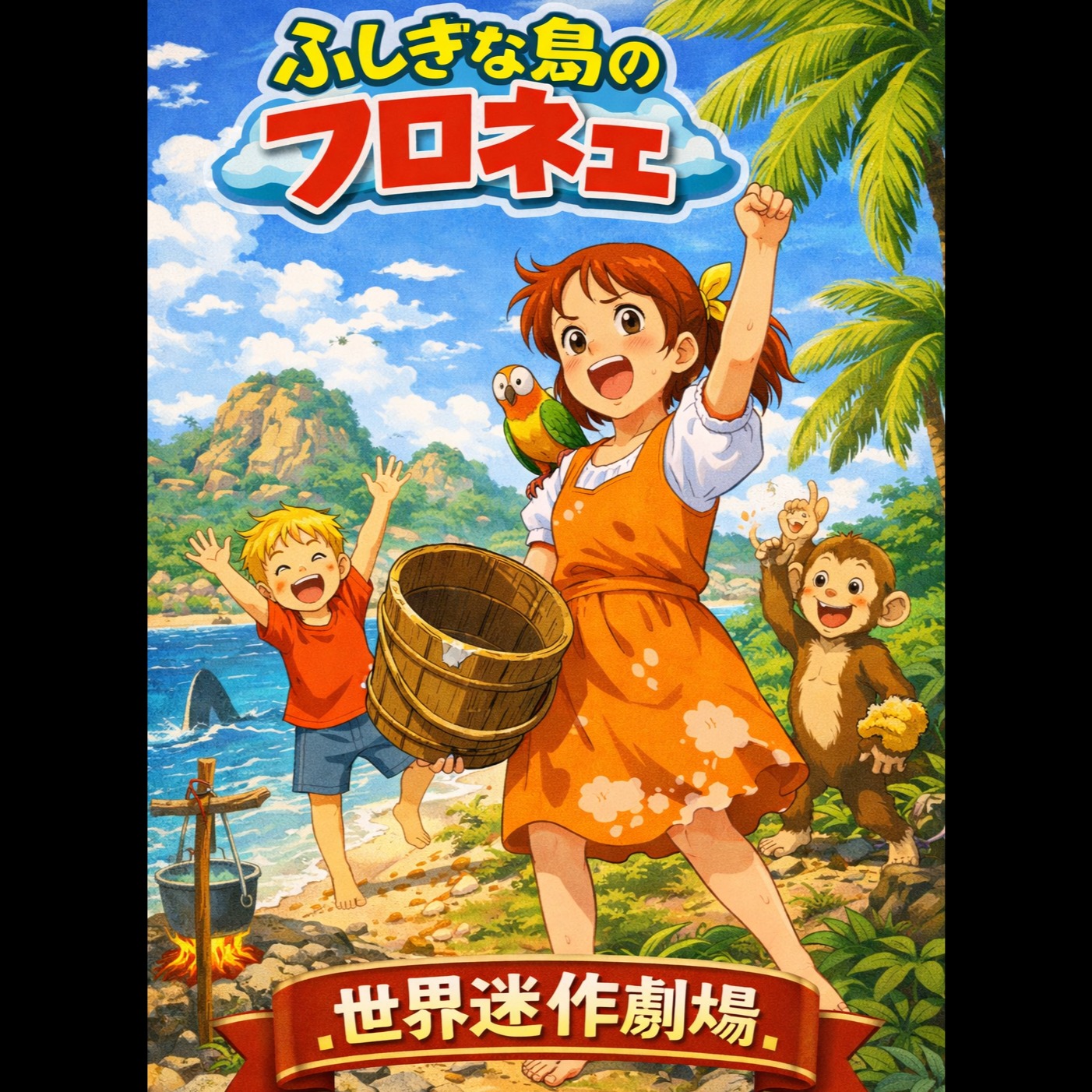 A bright, upbeat anime-style pop song inspired by classic 1970s Japanese family adventure anime openings, Fast tempo (around 135 BPM), major key, cheerful and energetic mood, Instrumentation includes acoustic guitar, light piano, playful flute or piccolo, soft strings, and bouncy drums with a slightly swinging rhythm, The arrangement should feel fresh, nostalgic, and adventurous, evoking a tropical island vibe, Female vocal, clear and youthful tone, lively and optimistic delivery, The singer should sound like she is happily running around an island, even when singing silly lyrics, Very catchy chorus with playful call-and-response energy, Keep it short (around 1 minute 30 seconds), simple structure, highly repeatable, Important contrast: The music should sound wholesome, innocent, and uplifting, while the lyrics are humorous and slightly absurd, Language: Japanese (hiragana-heavy lyrics), Style: retro anime opening, joyful, innocent, whimsical, playful, lighthearted, nostalgic
