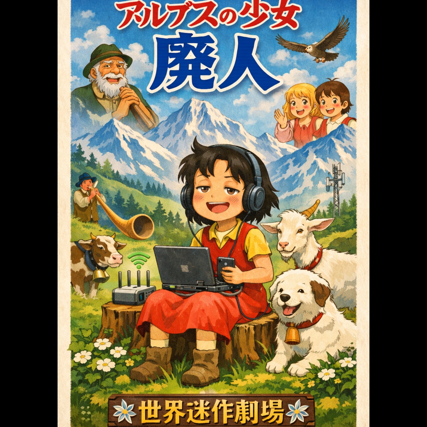 Retro 1970s Japanese anime TV-size opening theme with a bright alpine adventure atmosphere, Playful orchestral anime opening inspired by classic mountain adventure cartoons, Majestic yet cheerful sound with a large orchestral arrangement including strings, brass, woodwinds, timpani and snare drum, Upbeat bouncing rhythm like a joyful march, tempo around 145–155 BPM, creating lively vintage anime energy, Add alpine folk color with accordion and light folk percussion to evoke a pastoral mountain setting, The intro begins with a dramatic solo alphorn echoing across the mountains, joined by warm strings and woodwinds before the rhythm begins, Verses feel light and playful with pizzicato strings, clarinet and accordion, while the pre-chorus builds with expanding orchestration and rising brass, The chorus becomes a triumphant anime-style orchestral section with bright trumpets, sweeping strings and heroic horns, Include cheerful children's choir backing vocals for nostalgic anime atmospher