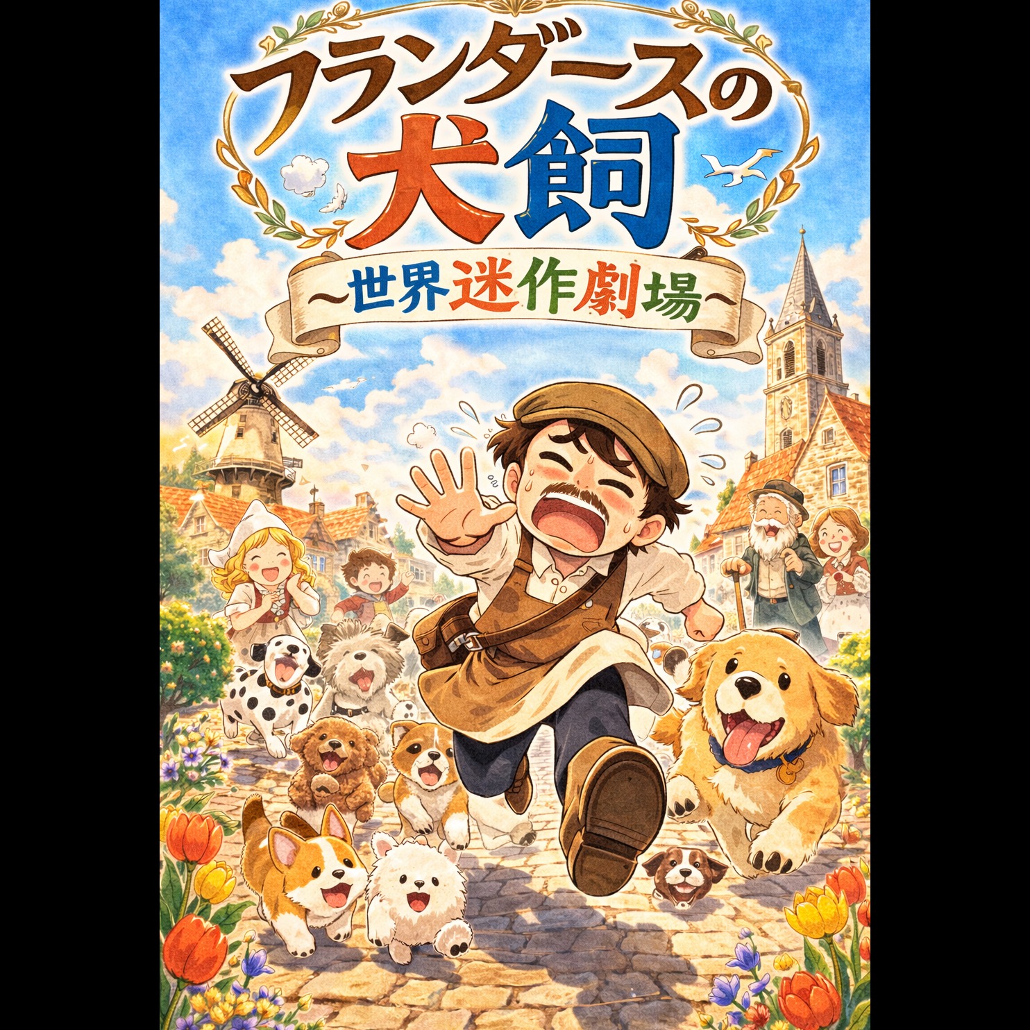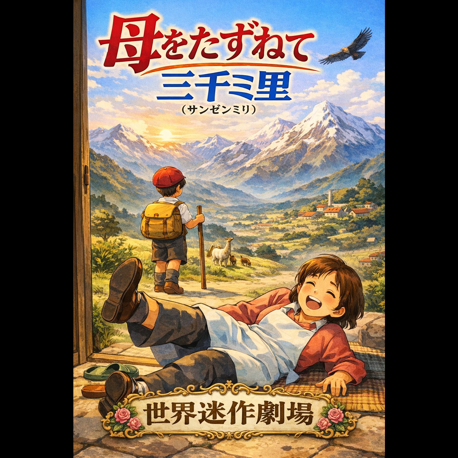 Nostalgic Japanese anime opening song, 70s–80s classic family anime style, pastoral European village atmosphere, acoustic guitar, flute lead melody, orchestral strings, soft choir, warm and wholesome tone, cinematic but gentle, medium tempo, uplifting and innocent mood