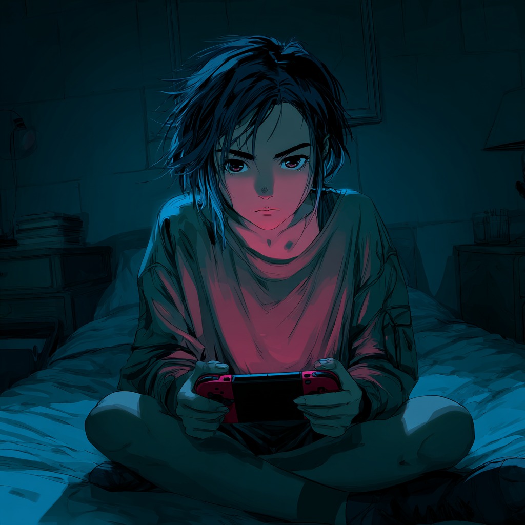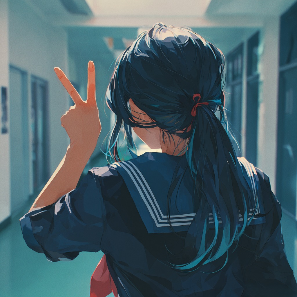 good girl anime future bass, 172 BPM, syncopated verse riff, palm-muted octave guitars, baritone guitar support, melodica hook, taiko backbeat, punchy live drums, pick bass, gang shouts, stereo chorus guitars, spring reverb, tape saturation, 90s alt-rock mix, half-time bridge, minor key pre-chorus, cathartic hook