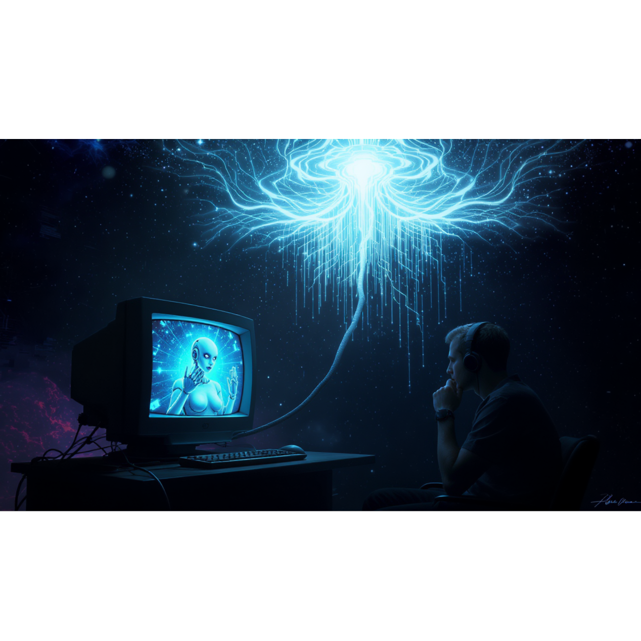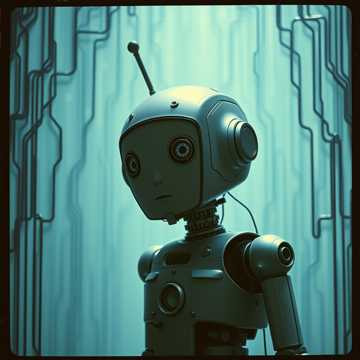 A modern electronic modern blues track led by a male singer with mid-range vocals using ironic, sarcastic phrasing and raw delivery, Deep emotive synths and cascading repeaters create a lush texture, “Ai System” vocal samples punctuate sections, A powerful deep bass supports soft robotic FX, Pitch Shifter with deepened effects