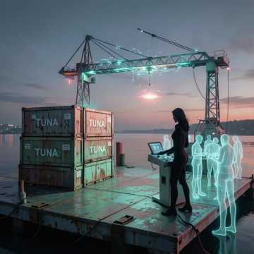 garage rock sea shanty • alt-jazz metal fusion • 120 BPM • punchy rhythmic crew chants • distorted accordion + gritty bass guitar • sonar synth textures • industrial dock ambience • female commanding lead vocal (slightly sarcastic, controlled rage) • call-and-response chorus vocals • cinematic glitch transitions • comedic corporate sci-fi tone • escalating intensity → breakdown → explosive final chorus