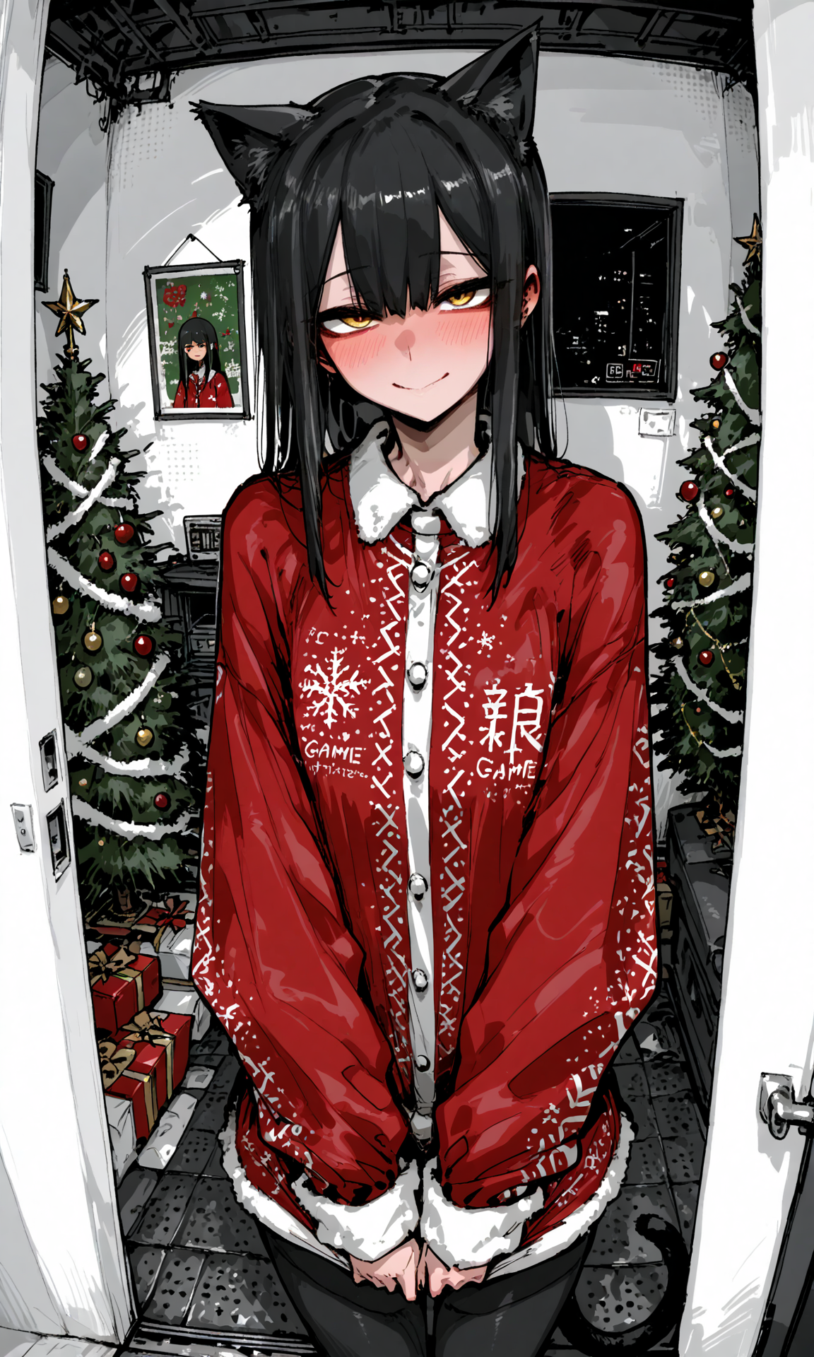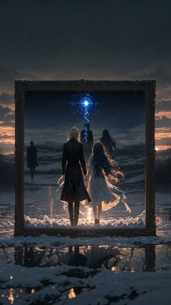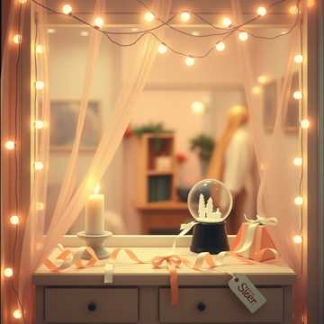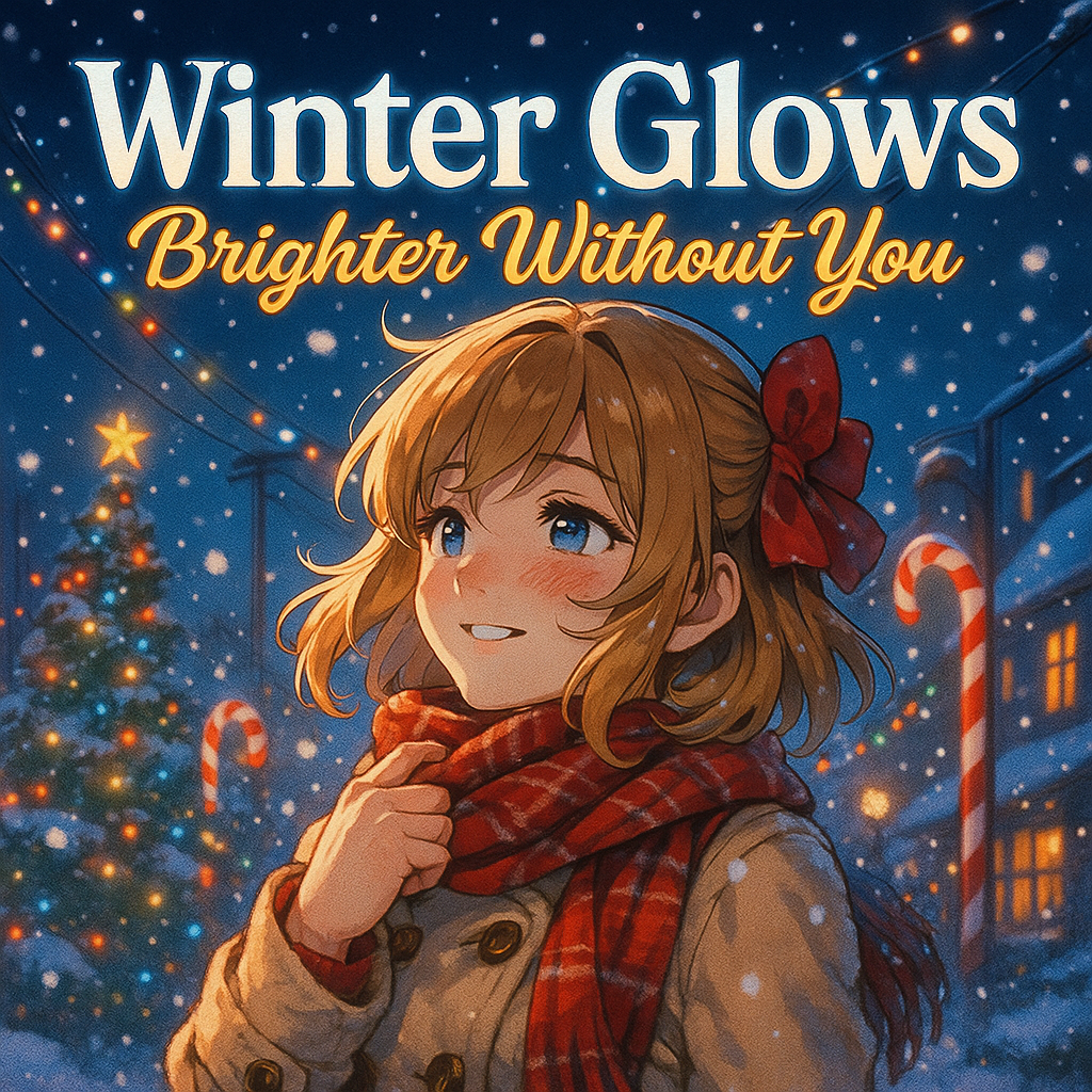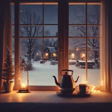 Atmosphere: Snowy window glow, warm breath in cold air, late-night reflection, soft melancholy uplift