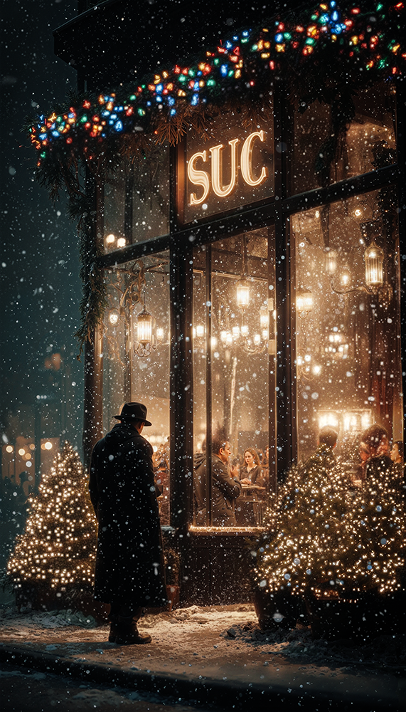 [ambience: Snowy city night, warm indoor glow, soft choir “oohs, ” shimmering bells]