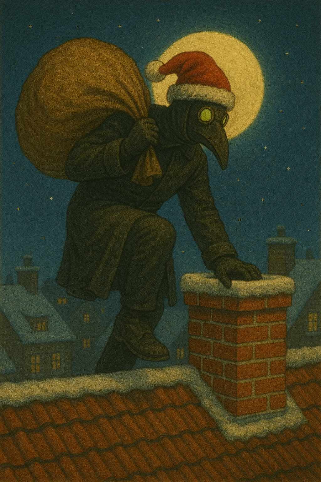 A dark cabaret song with festive holiday elements, Upright bass, brushed drums, and theatrical piano form the core groove while light djent guitar accents add punch and syncopation, Sleigh bells, chimes, glockenspiel, and soft orchestral strings weave a whimsical Christmas texture, Brass swells and woodwinds emphasize dramatic moments, Vocals are expressive, playful, and theatrical with clear storytelling delivery and warm harmonies, The overall tone is mischievous, seasonal, and lively with a blend of jazzy swing, metal undertones, and festive sparkle