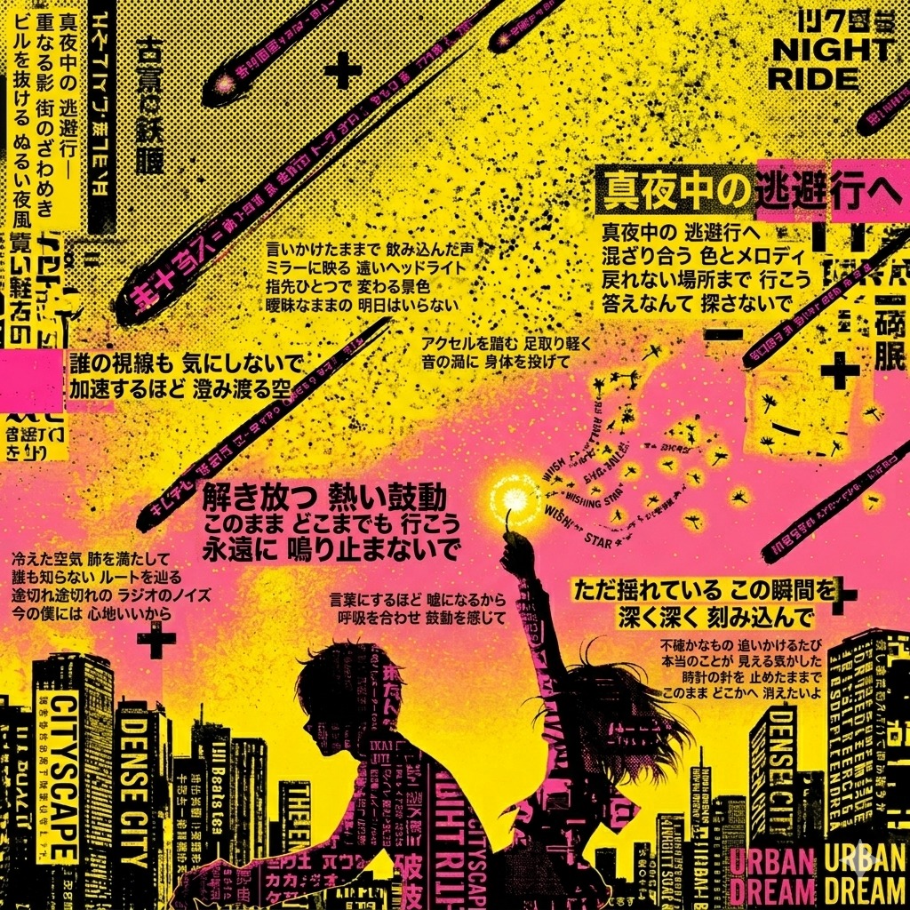 J-Pop fusion track featuring a blend of funk, jazz-fusion, and power pop elements, The arrangement is driven by a highly syncopated, slap-heavy electric bassline and a tight drum kit with a crisp snare and active hi-hat work, Clean, rhythmic electric guitar scratching and jazz-inflected chord stabs provide harmonic texture, A prominent brass section featuring trumpets and saxophones delivers punchy staccato hits and melodic flourishes, The lead vocals are energetic male tenor, often doubling in harmony during the chorus, A technical, fusion-style electric guitar solo appears mid-track, characterized by rapid alternate picking and fluid legato runs, The tempo is approximately 128 BPM in 4/4 time, likely in the key of B Major, Synthesizer layers include bright poly-synths and occasional filter-swept pads