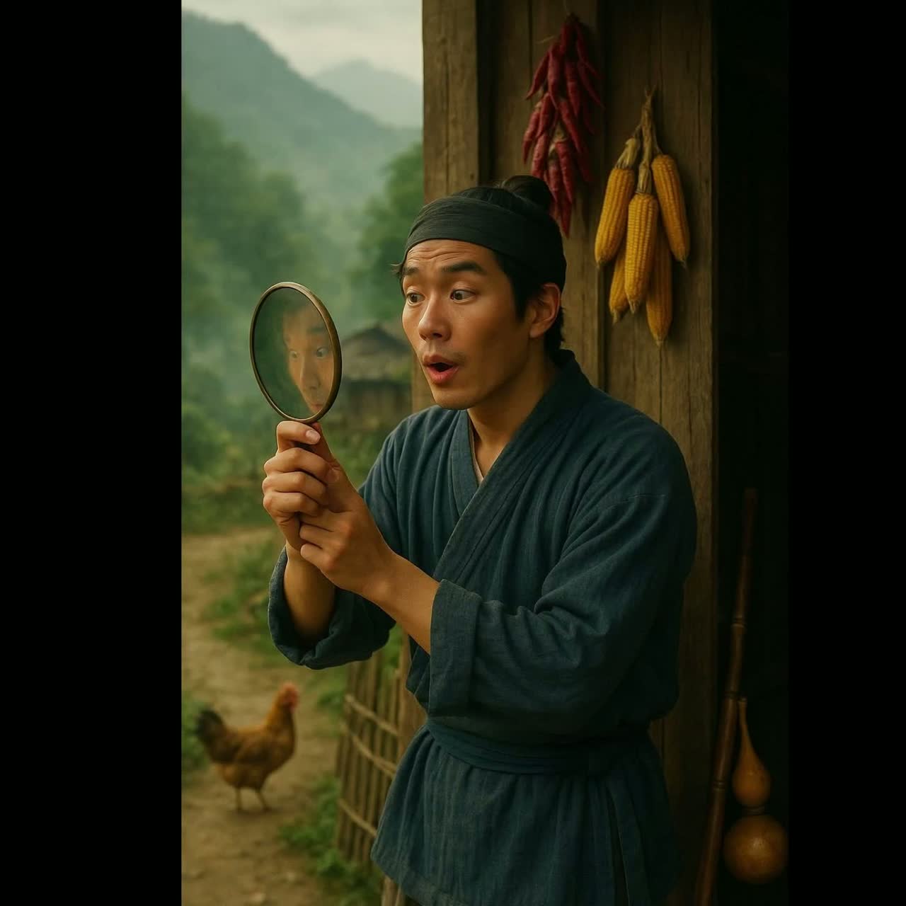Style: Mandarin Yunnan-style folk song with light-hearted, humorous tone, Combines traditional mountain instruments (hulusi, sanxian, moon lute, bamboo flute) and retro analog village vibe like 1970s countryside field recordings, Feels like someone vain yet clueless singing alone in misty hills, Mood: Playful · Folkloric · Retro · Sleepy Morning · Self-Mocking