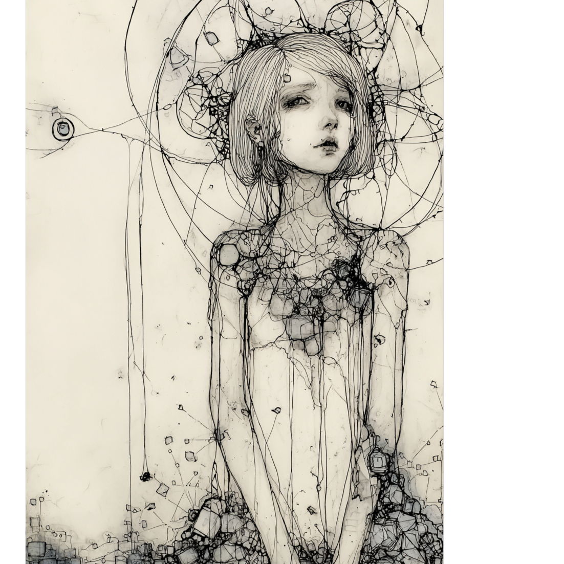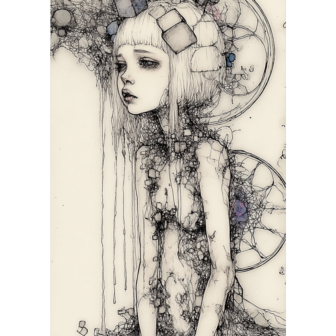 liquid drum'n bass, Poetry Recitation by women, fast tempo, Darkness and very melancholic, lo-fi, husky and deep voice, Strong sensation of floating and intoxication, 80's synth sound